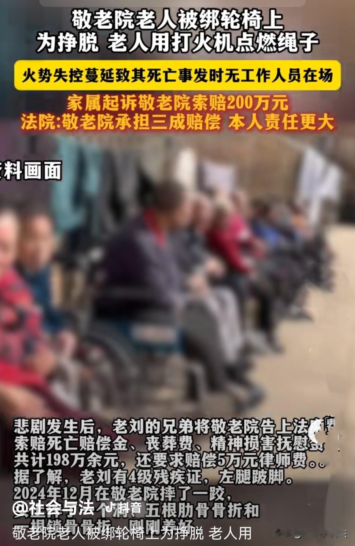 上海,60岁大爷无儿无女,又左腿跛脚,是4级残疾,脾气又不好。其兄弟无力照顾将他送至养老院,谁知他竟在养老院摔了一跤,至5根肋骨和一根锁骨骨折,修养好后脾气更加暴躁。凌晨非要起床,不然就大吵大闹,护理员无奈帮他穿上衣服,将他推至6楼,用尼龙绳把他固定到轮椅上,就去忙别的了。谁知,大爷移动轮椅至1楼后,用打火机点燃绳子,火势失控蔓延致其死亡,事发时无护理员在场,其兄弟起诉敬老院索赔198万元,法院这样判的! 60岁老刘左腿跛脚,属于4级残疾,行动一直不方便。他妻子早逝,又无留下一儿半女,年轻时脾气就大,老了也不知收敛。 其兄弟看他可怜,可又无力照顾,便与他商量将他送去了养老院,觉得会得到很好照顾,不再担心他吃不上饭。 2024年12月,他在敬老院不小心摔了一跤,头上磕出了一个洞,还摔断了5根肋骨和1根锁骨。 这次摔的可不轻,因为疼痛,老刘的脾气变得更加暴躁,动不动就发火吵闹,把护理员整的也没办法。 经过2个月时间的治疗与修养,他的伤才慢慢恢复,本以为他的伤马上就恢复好了,他脾气就能好些了。 谁知,2025年2月12日凌晨,老院内的老人都已进去了梦乡,老刘在房间里却大吼大叫,执意要起床。 护理员孙某赶紧跑来并劝他安静,半夜三更的起床干嘛呢? 不管护理员孙某怎么劝,他都听不进去,态度十分执拗。 到了凌晨3点,孙某实在劝不住,怕他吵醒其他老人,无奈帮他穿好了衣服,把他扶到轮椅上推至6楼大厅。 孙某夜间值班的人手不多,他还要照顾管理其他老人,万般无奈,便找来尼龙绳将他固定在轮椅上,防止他乱动再摔伤了。 她叮嘱老刘好好在这待一会,她很忙,还有其他事情要做,便离开了。 孙某想着让老刘自己先在这舒缓一会,看看夜景,平复下情绪,自己忙一会就回来推他回房。 万万没想到,孙某看似稳妥的操作,却为悲剧埋下了伏笔。 老刘看孙某离开,自己被绑在轮椅上,越发觉得不舒服,倔犟地在轮椅上扭动,想要挣脱束缚。 看绑的结实,无法挣脱便自己操控着轮椅,乘着电梯悄悄下到了一楼大厅,整个过程没有任何工作人员发现。 老刘还是没能解开身上的绳子,他越发暴躁,情绪失控。 凌晨3点25分,他竟从衣服口袋里掏出打火机,想烧断绳子就能摆脱束缚自由了。 谁知,尼龙绳是易燃物,点然后火势蔓延得很快,老刘试图灭火,可他伤情还未完全恢复好,腿脚又不方便,根本无能无力,控制不住。 从点火到火焰烧身,短短11分钟,老刘从轮椅上滑落,整个过程中,敬老院没任何工作人员在场。 直到凌晨4点17分,警方接到报警赶到现场,老刘已没了生命体征,葬身火海。 其兄弟刘先生悲痛欲绝。他认为,凌晨3点把行动不便的老人独自丢在大厅,看护严重缺位,且未发现老人自行下楼,还用易燃的尼龙绳代替规范的束缚带,存在极大安全隐患,这才导致了悲剧发生。 刘先生愤怒地将敬老院告上了法庭,索赔死亡赔偿金、丧葬费、精神损害抚慰金等共计198万元,还要求赔偿5万元律师费,总索赔金额近200多万元。 事发后,敬老院先行垫付了25万元来办理老刘的身后事,对刘先生索要数额不能接受,只能等待法院判决。 说实话养老院真是难辞其咎,把60岁腿脚不便、还带着伤的老头,大半夜扔在六楼大厅,用根尼龙绳一绑就不管了,这心得多大? 当然,老刘自己也有责任。都伤成那样了,还半夜吵闹!脾气暴躁归暴躁,但成年人总得为自己的行为买单! 不过话又说回来,他无儿无女,身体残疾,性格孤僻暴躁,可能也是长期缺乏关爱和病痛折磨导致的,他凌晨被推至外面,肯定觉得自己被孤立,不被重视,心理失衡了! 《民法典》第1198条,……公共场所的经营者、管理者或者群众性活动的组织者,未尽到安全保障义务,造成他人损害的,应当承担侵权责任。 敬老院作为专业养老服务机构,对入住老人负有法定安全保障与照护义务。 老刘曾摔伤且行动不便,护理员用易燃尼龙绳而非规范防护措施捆绑约束,已存在安全隐患。 将绑缚后的老人独自留在6楼脱离看管,导致其自行下楼、点火引发事故,具有明显过错,应承担相应侵权责任。 《民法典》第18条第一款规定:自然人具有完全民事行为能力,可独立实施民事法律行为,并承担相应法律责任。 法院审理后查明,事发前一天晚上,老刘在敬老院走廊抽烟,护理员劝阻被凶。 老刘虽有残疾,但能自己拿到打火机、独自操控轮椅下楼,说明他具备一定的行动能力和判断能力。 作为完全民事行为能力人,他应当预见点火烧绳的危险性,却依然采取了这种极端方式,自身需要承担主要责任。 法院结合双方过错程度,认定老刘自身承担主要责任,敬老院因未尽安全保障义务承担30%次要责任。 最后法院判决:敬老院承担30%赔偿责任60多万元,扣除已垫付的25万元,还需赔偿35多万多元。 您觉得敬老院赔偿冤吗?