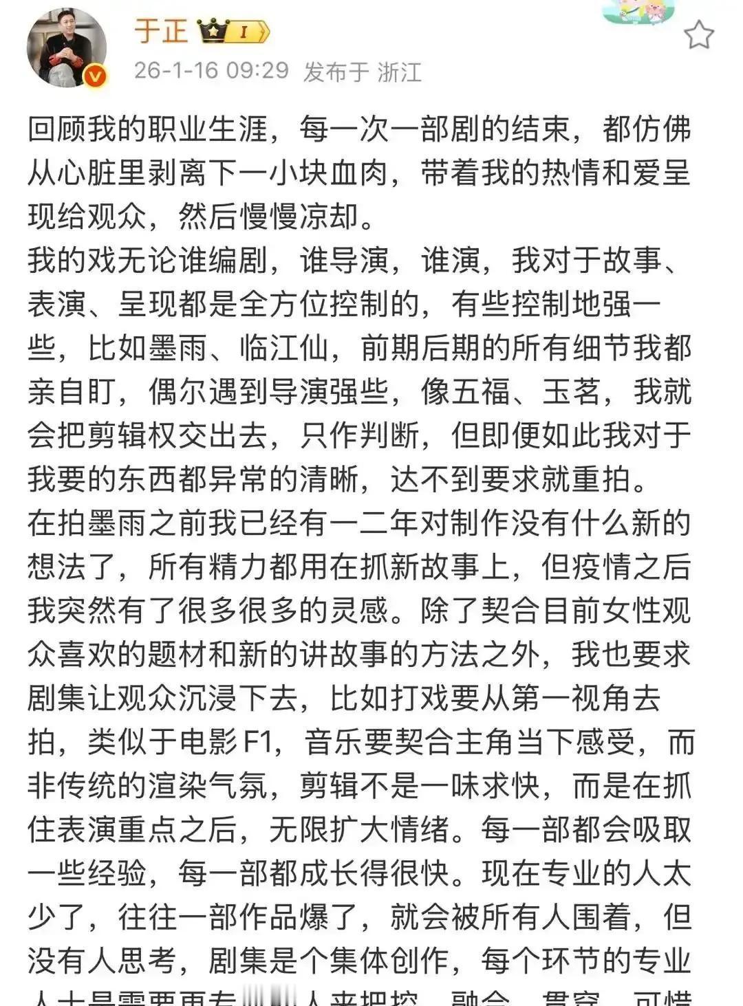 于正突然宣布《玉茗茶骨》不拍了,还把锅全甩给导演。 他说自己砸钱砸感情,结果导演坚持个人审美,完全不听商业建议,最后片子没法见人。 网友立刻翻出他去年夸这导演“有灵气”的截图,前后反差太大,直接被嘲“甩锅王”更尴尬的是,他过往多次换导演、改剧本、抢剪辑,每次出事都把责任推给别人,这次又来一遍。 圈内人透露,其实就是制片人和导演创作分歧,但于正非要在微博升堂,把矛盾公开化。 导演至今没回应,估计职业生涯要凉,项目也彻底黄了。 当老板的该背锅就背锅,别一出事就推给打工人。 合作前夸上天,合作后踩到底,这种玩法谁还敢接你的戏。