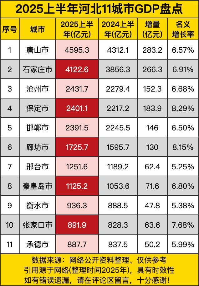 唐山那可是一马当先,以4595.3亿元的GDP稳坐老大宝座。就像班里的学霸,每次考试都名列前茅,这增量283.2亿元,名义增长率6.57%,实力杠杠的,其他城市可得加把劲儿追赶啦! 再看石家庄,也不甘示弱,GDP达到4122.6亿元。紧追着唐山的步伐呢,就像个不服输的小能手,增量266.3亿元,名义增长率6.91%。这俩城市就跟武侠小说里的高手过招似的,你来我往,精彩得很,就看以后谁能更胜一筹咯! 不过呀,也不是只有这两个城市厉害。保定、廊坊这些城市也不容小觑。保定GDP2401.1亿元,名义增长率8.29%;廊坊1725.7亿元,名义增长率8.15%。它们就像班级里的潜力股学生,默默发力,说不定哪天就弯道超车,在经济赛道上跑出自己的风采! 至于剩下的城市呢,虽然目前GDP数值相对没那么高,但也都有着自己的节奏。就像班级里的普通同学,都在一步一个脚印地前进。相信在未来,河北这些城市都能不断进步,一起把经济搞得红红火火,咱就等着看它们的新表现啦!