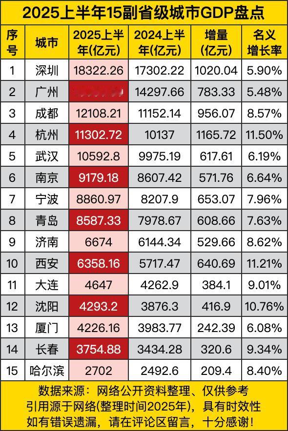 深圳稳坐第一把交椅,GDP达到18322.26亿元,增量超千亿,名义增长率5.90%,就像班级里的学霸,每次考试都名列前茅,让人不得不服。 再瞧瞧成都和杭州,一个是西部翘楚,一个是东部新贵。成都GDP12108.21亿元,增势迅猛;杭州更厉害,以11302.72亿元紧随其后,名义增长率高达11.50%,仿佛在赛道上一路狂飙,把不少城市甩在了身后。 不过,也不是所有城市都这么风光。有的城市增量和增长率就相对低一些,像是还在努力追赶的小选手。但这也不能气馁嘛,毕竟城市发展各有节奏,说不定哪天就能来个弯道超车呢! 总的来说,这份GDP盘点就像一场城市发展的“成绩单”。有领先的优势,也有追赶的动力。咱就等着看这些城市在未来还能给我们带来啥惊喜,是继续保持辉煌,还是实现逆袭翻盘,咱们拭目以待!