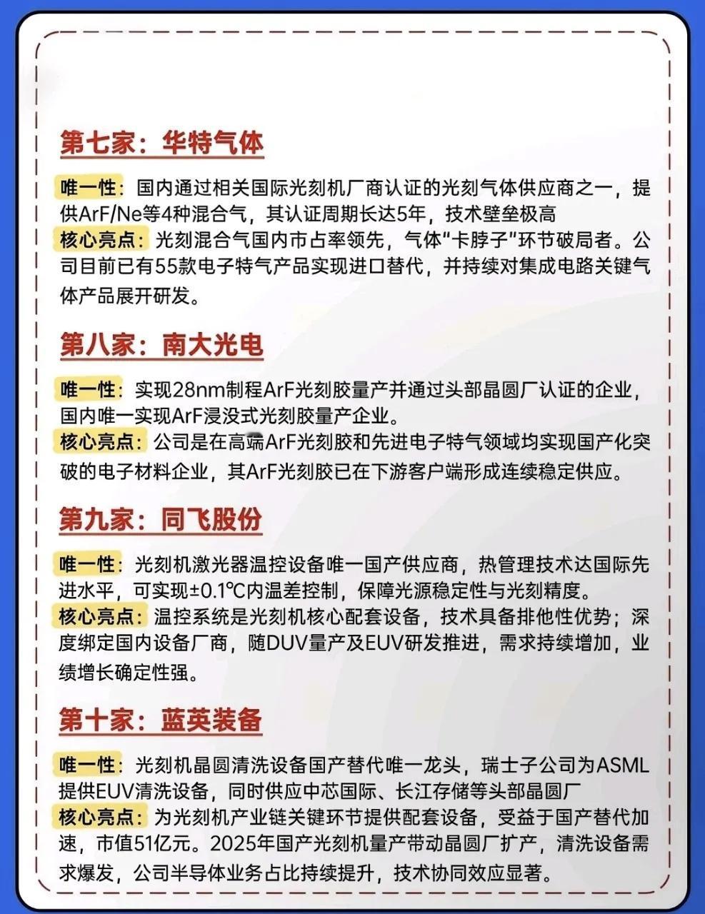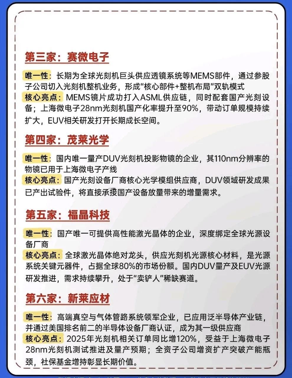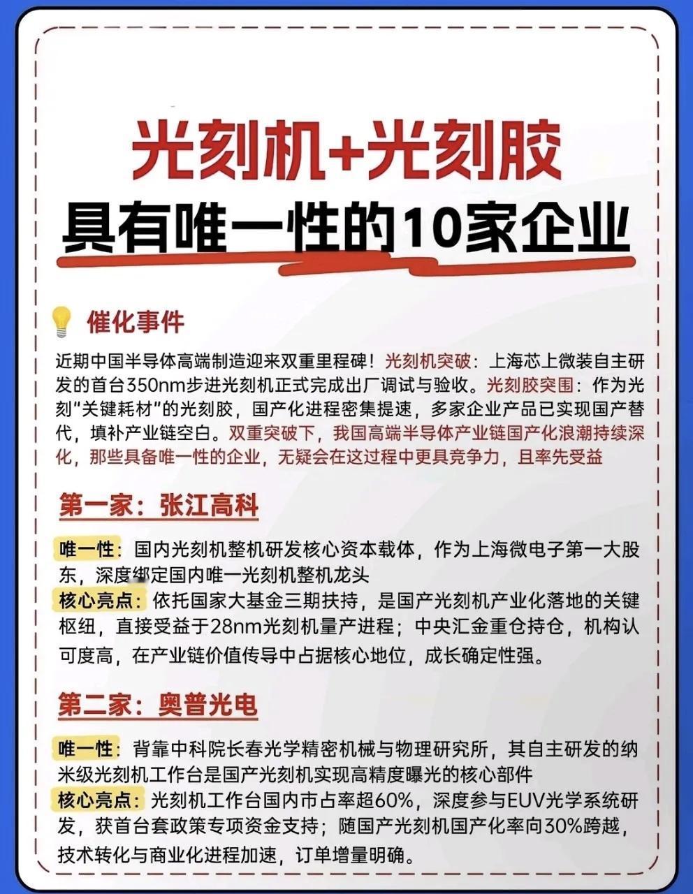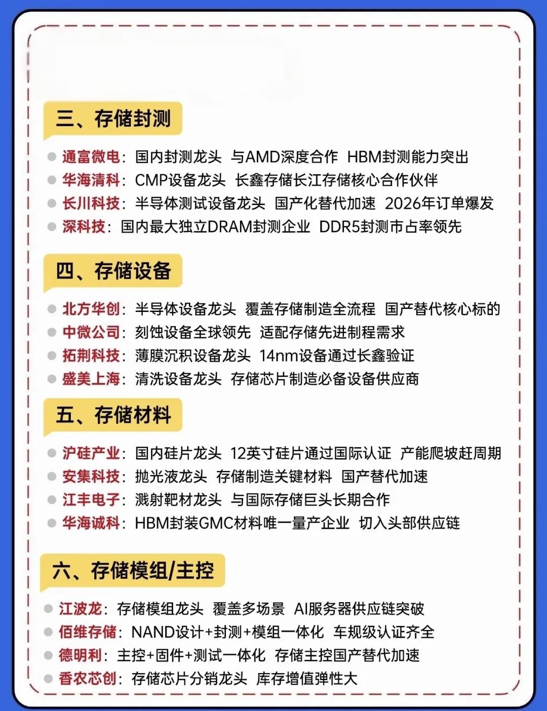 重磅分享:存储芯片6大方向+光刻机10大龙头梳理! 🔥 炸了!国产半导体的“黄金时代”已来!一边是光刻机与光刻胶领域10家具备唯一性的硬核企业,在“卡脖子”环节实现技术突围;另一边是存储芯片产业链在涨价、扩产与国产替代的三重驱动下,从设计、制造到封测、材料全链条加速崛起。 张江高科:作为上海微电子的第一大股东,是国产光刻机从技术突破走向量产落地的关键推手。 佰维存储:凭借NAND设计+封测+模组一体化的全产业链布局,在存储领域建立了独特的竞争优势。 福晶科技:国内唯一可提供高性能激光晶体的企业,深度绑定全球光源设备厂商,是光刻机光源系统的核心元器件供应商,占据全球80%的市场份额。 投资有风险,决策需谨慎。上述风险可能直接影响相关企业的经营业绩与估值水平,建议投资者结合行业周期、企业核心竞争力及风险承受能力理性布局。