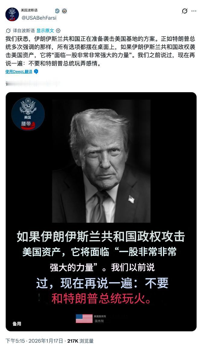 伊朗要打击美国军队?你没看错,美国国务院17号在X网站上以波斯语发表声明称“我们