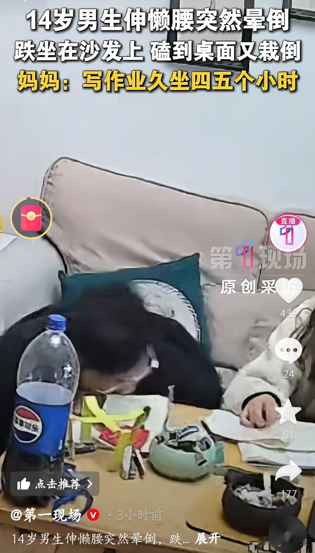 我的妈呀,我也经常这样,久坐后伸懒腰,两眼一黑,心跳加速!看到湖南常德这个14岁的初中生,我直接代懵了! 这孩子写作业连坐四五个小时,伸个懒腰突然就晕倒了,先是跌坐在沙发上,又磕到桌面,最后直接栽倒在地。妈妈说他平时就总久坐写作业,这次可把人吓坏了。 这不就是当代学生和打工人的真实写照吗?一坐就是大半天,身体早就发出警告了。伸懒腰时猛地起身,大脑供血跟不上,眼前发黑、头晕都是身体在喊救命。 真的要警惕!别等摔出事儿才重视。每隔一小时就得站起来走走,哪怕只是接杯水、站着看会儿书,都能让血液循环起来。尤其是正在上学的孩子,家长一定要盯着,别让久坐熬坏了身体。