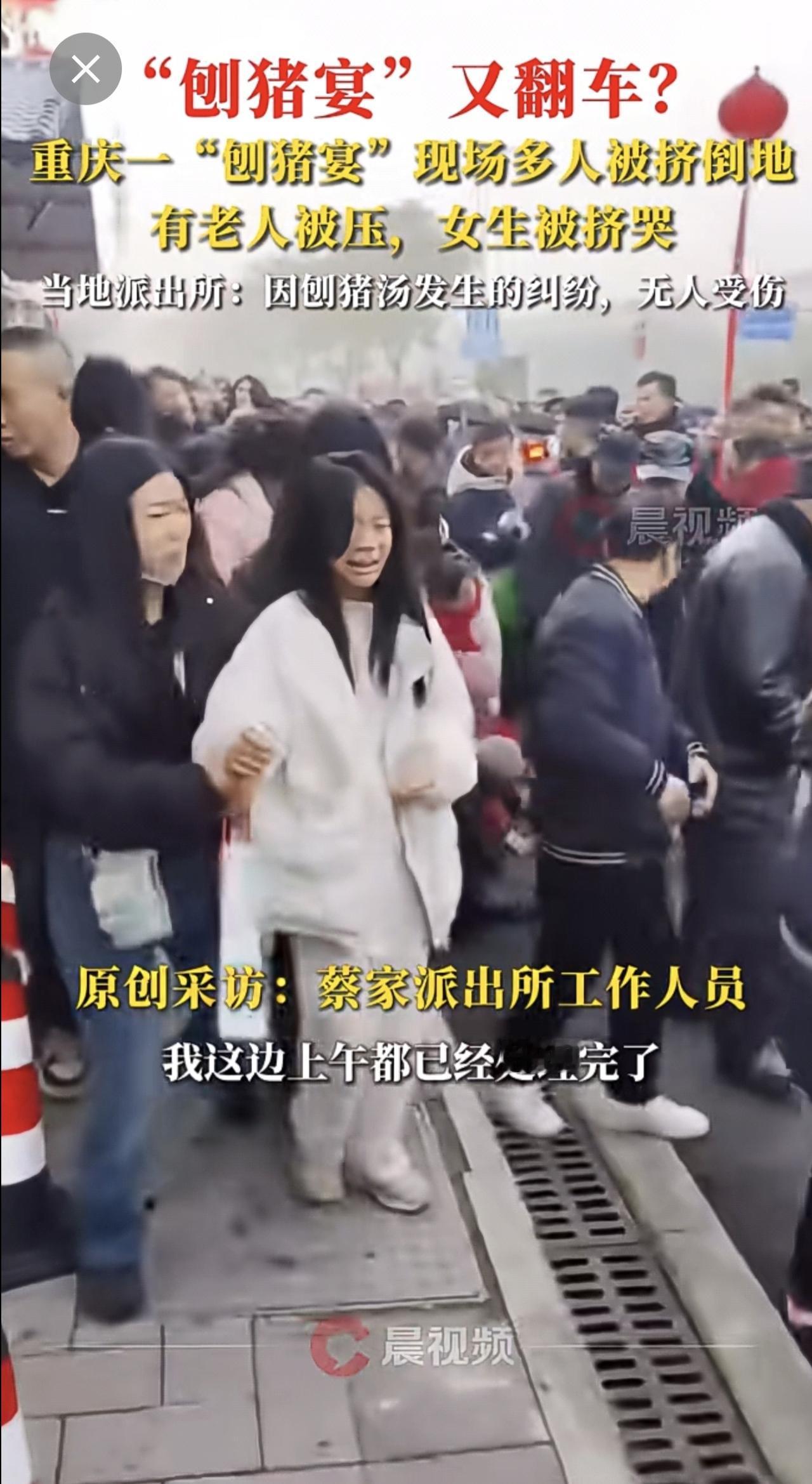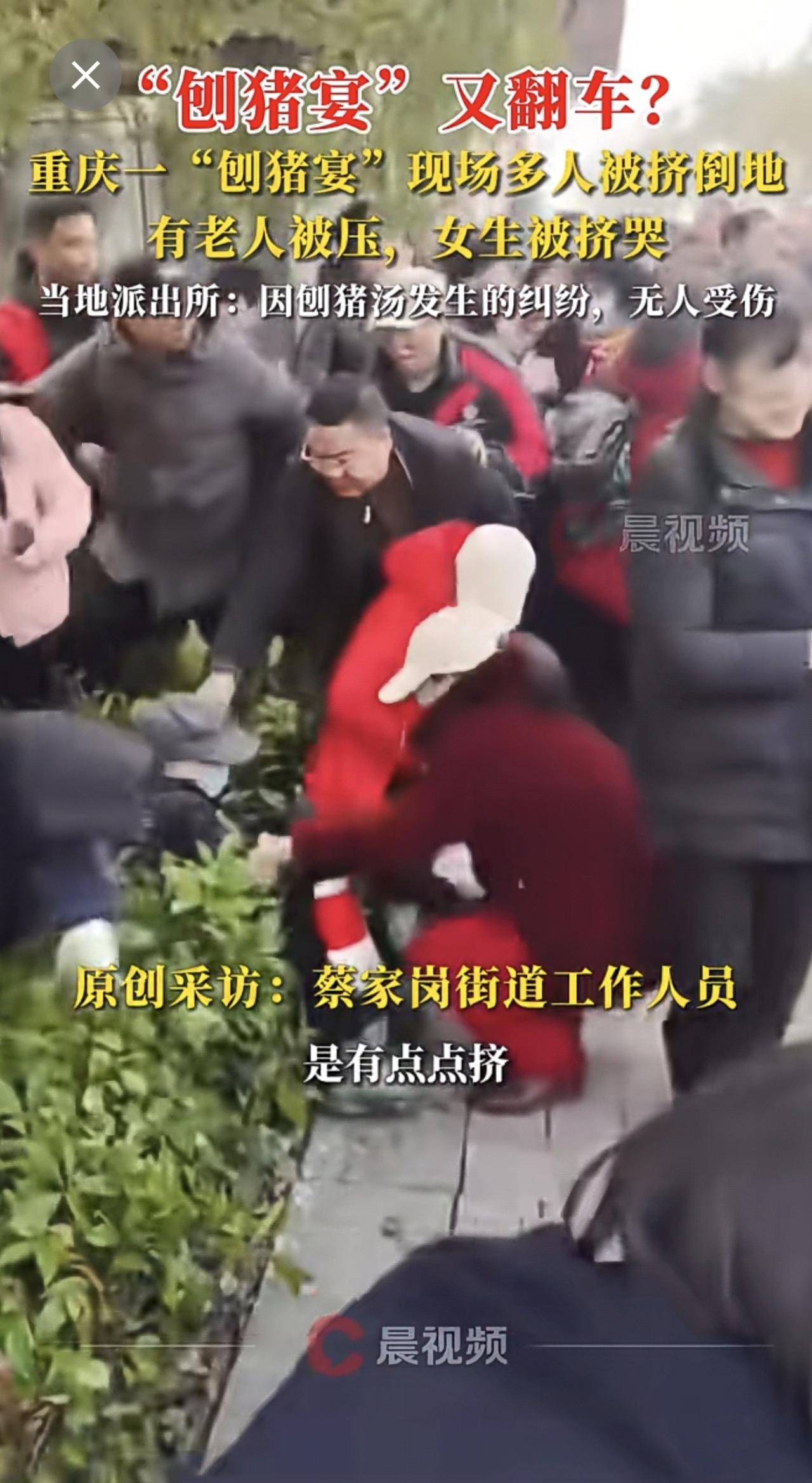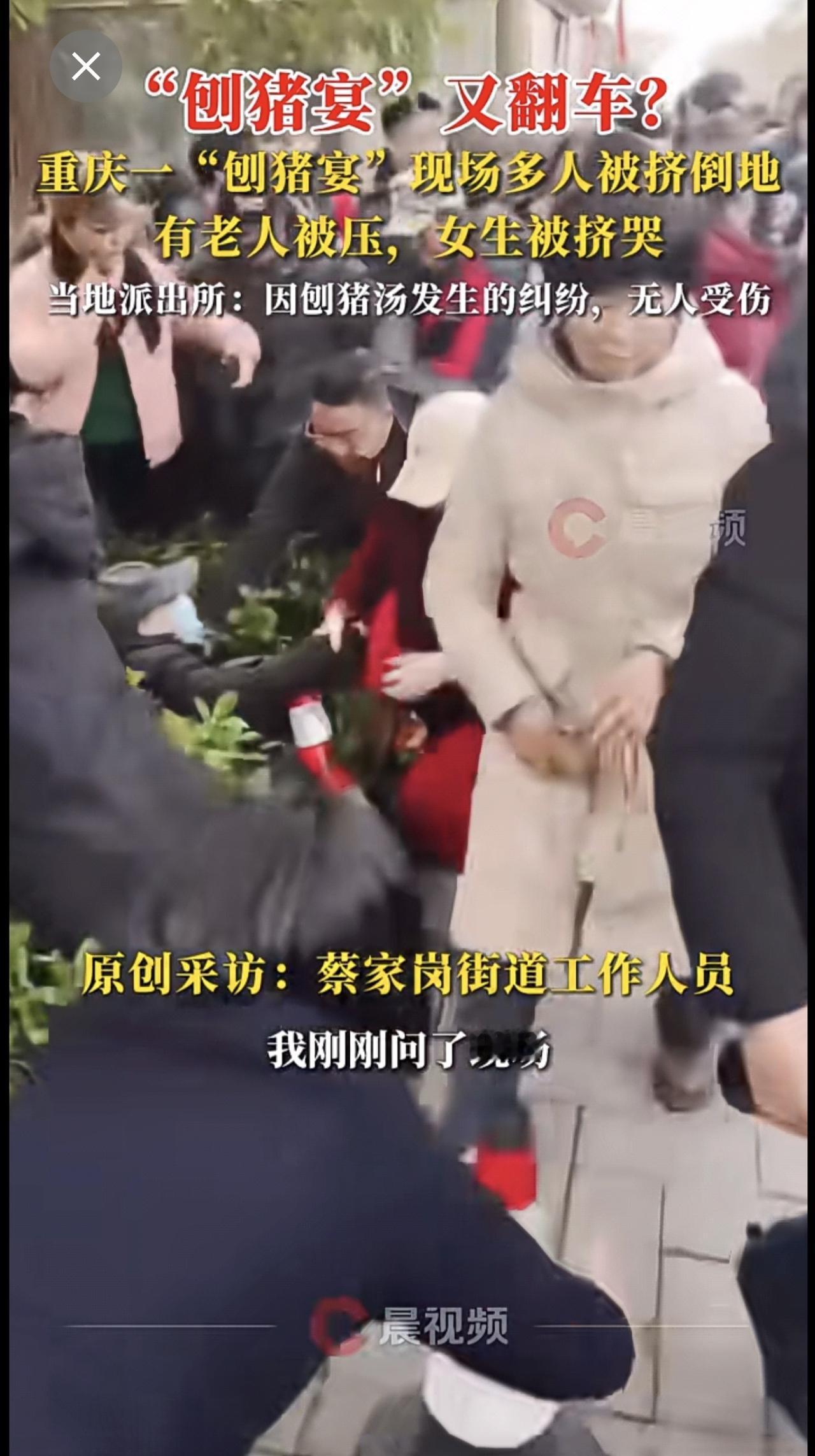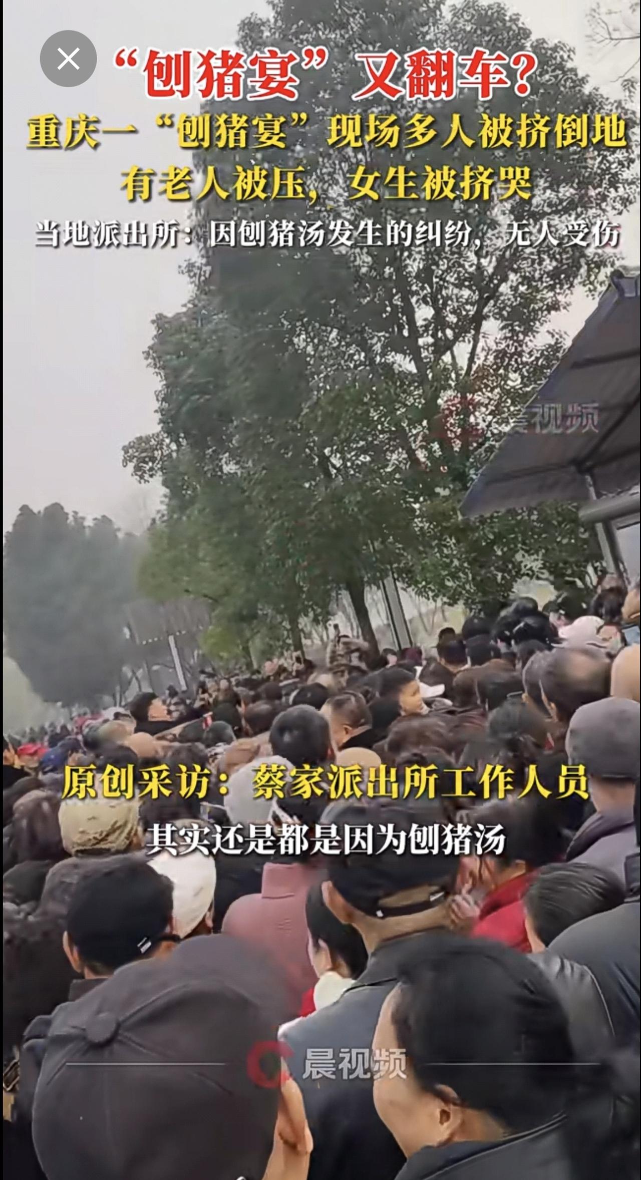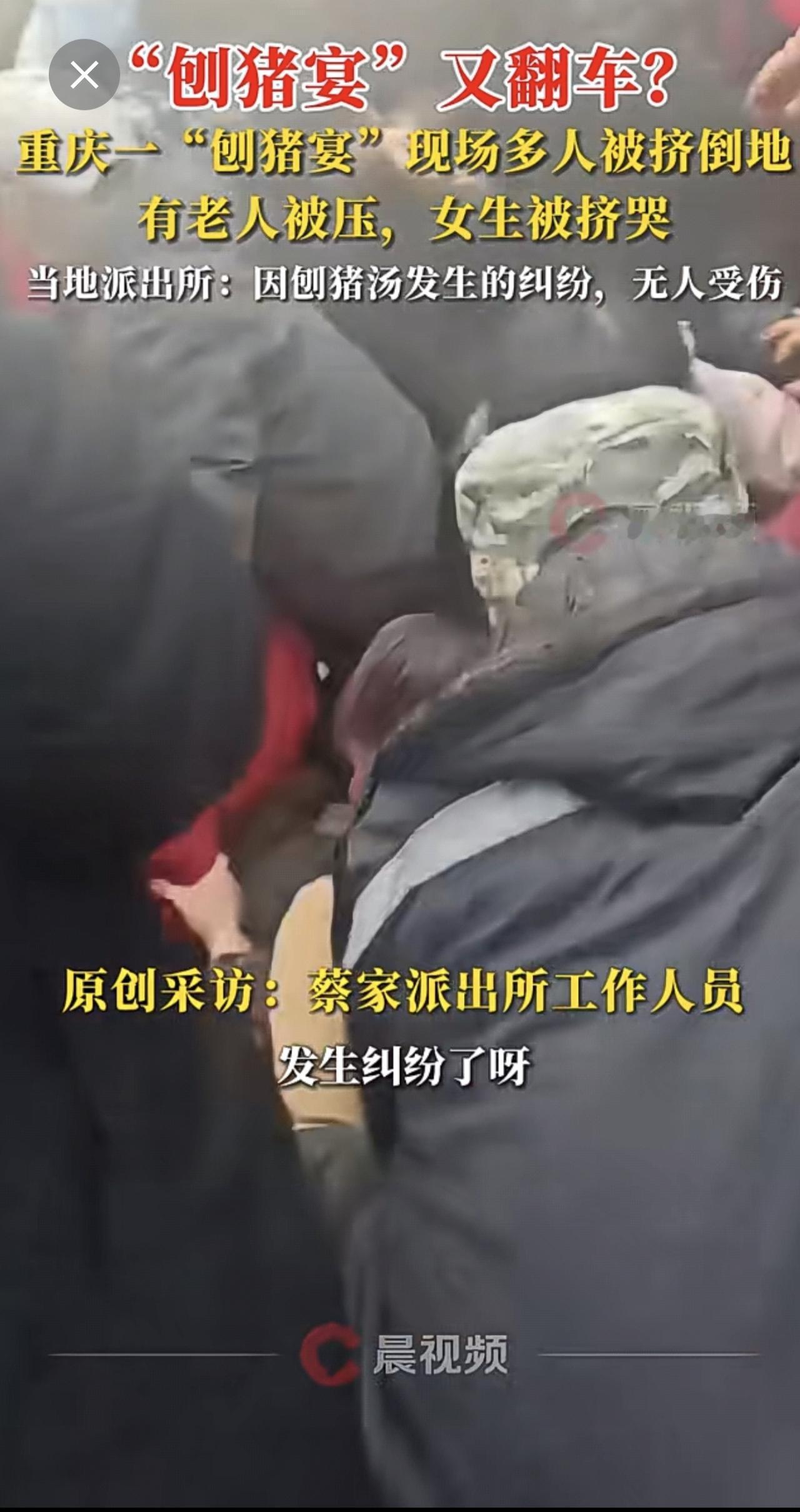 “刨猪宴”又翻车?重庆一“刨猪宴”现场多人被挤倒地,有老人被压,女生被挤哭,当地派出所:因刨猪汤发生的纠纷,无人受伤。
