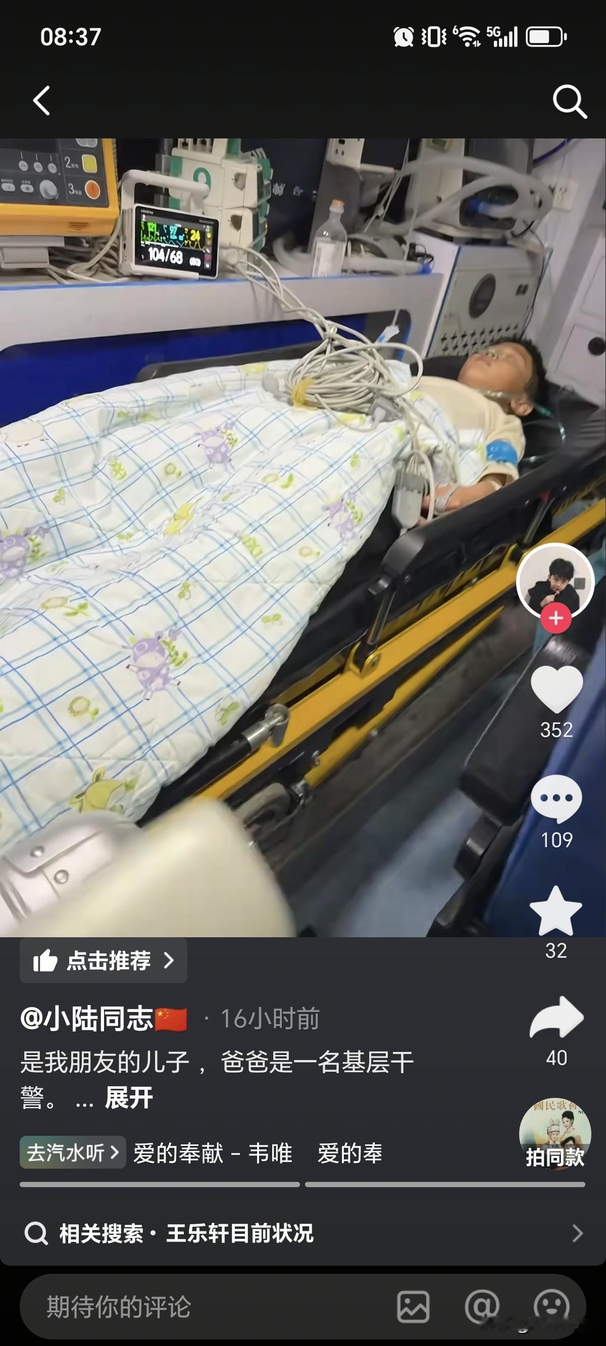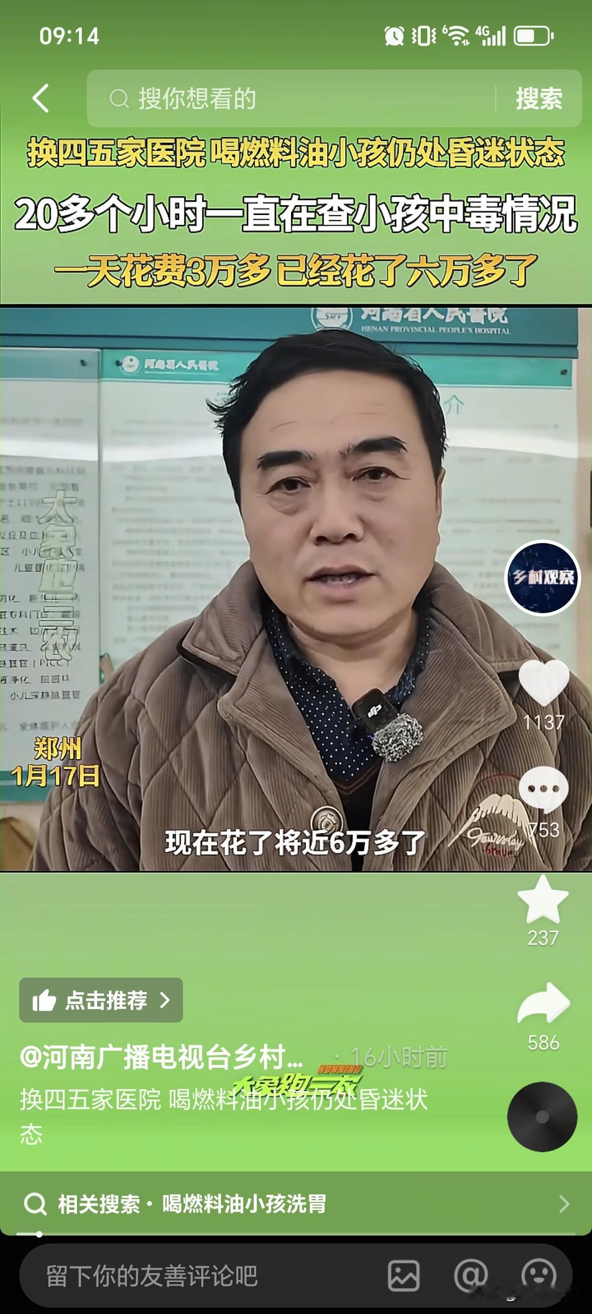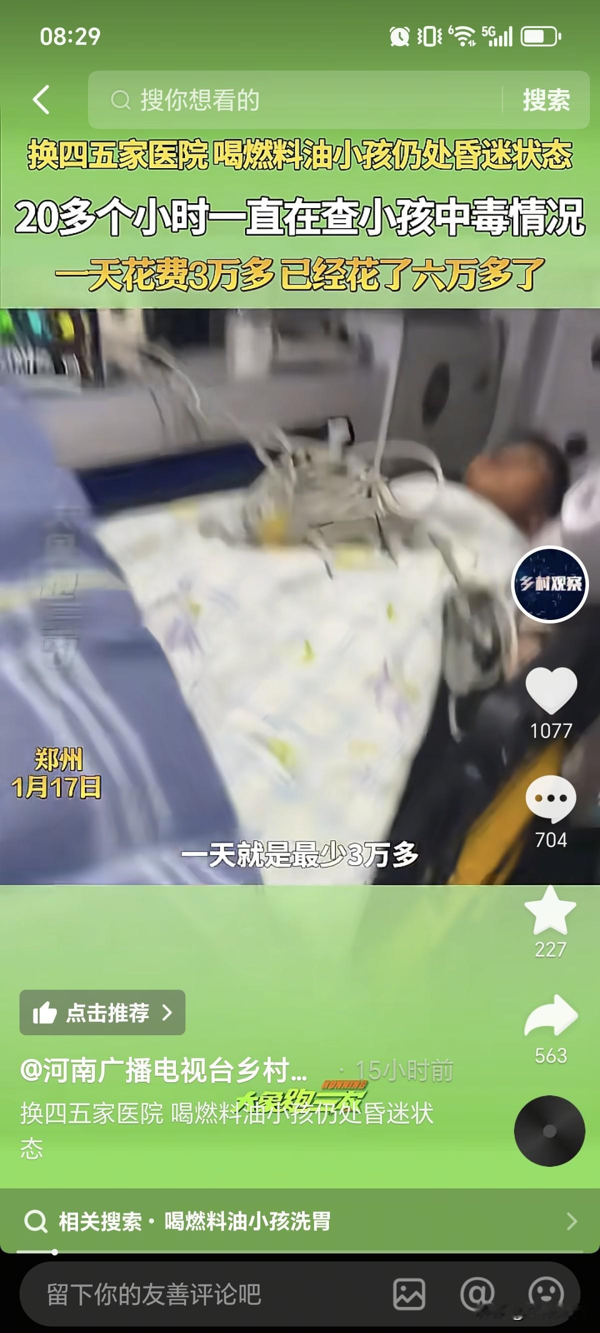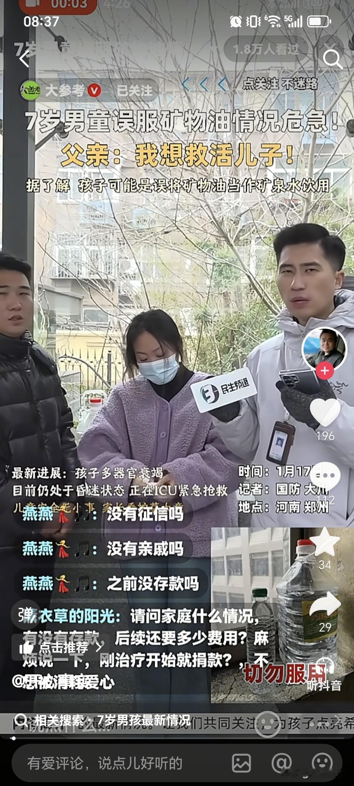 各位网友现在别指责家长粗心大意把矿物燃料当水给7岁男孩喝了,关键问题,目前人躺在ICU,一天要3万块钱费用,已经花了6万,至于多久能够出来,医生也无法精准判断。 所以后续需要大量的钱来治疗,亲戚朋友能借的都借遍了,实在没办法,求助了河南当地民生频道记者,想通过募捐的方式来度过困难。 当地知情人说:爸爸是一位辅警,工资几千块钱,房子不能卖,属于农村自建房。从而也证实了家里确实积蓄不会太多。 每个人奉献一点爱心吧,无论10块钱,还是20块钱,帮助一下[泣不成声][泣不成声][泣不成声]。