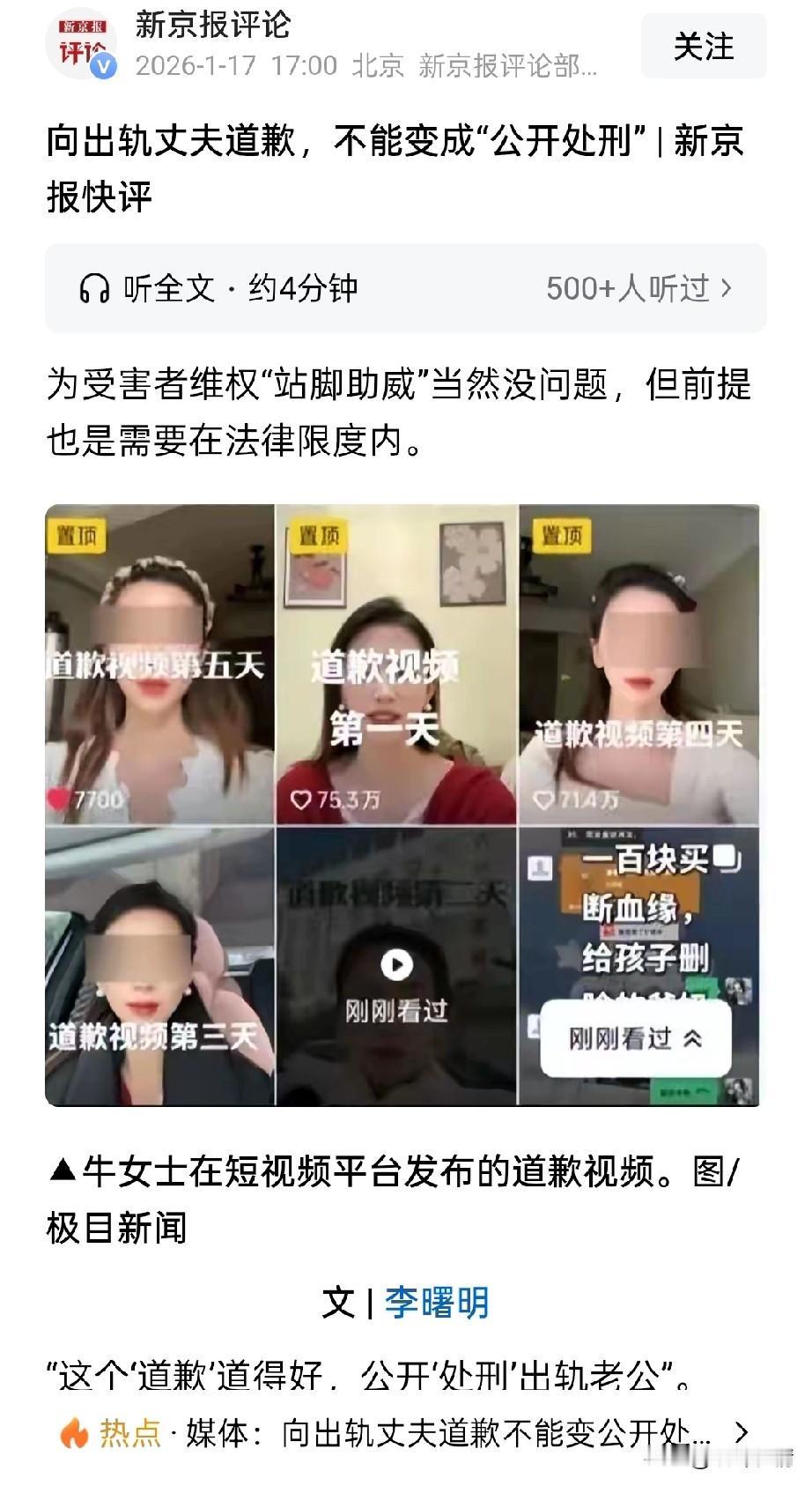 向出轨丈夫道歉,不能变成公开处刑!这是新京报刚发的报道,网友对报道的评价更搞笑! 网友表示建议媒体干点正事!道德约束不了,那就道德谴责, 还有网友表示新京报,为啥着急?我觉得道歉挺正经的!几乎都是一边倒的批评《新京报》! 报道的三位作者均被问候了一遍,河南女子向出轨丈夫道歉这事,说实话只是一个受伤的女子,在向丈夫国企公司反映无人管的情况下,最无奈的宣泄手段! 法院判决侵犯名誉权,道歉15天,公婆更是在小三和丈夫的撺掇下花100块钱断亲,这实在是令人费解! 她的女儿毕竟是高飞的亲生女儿,生病了也得不到父亲的关注,一切就因为出轨了韩润!除了年轻一无是处! 更让人生气的是,高飞居然家暴,将牛娜女士打的遍体鳞伤,原本美好的家庭,因为出轨一地鸡毛! 小三韩润还真是聪明,为了不被追回钱款,居然让高飞给他拿现金,之前买的羽绒服和丝袜已经满足不了她的胃口! 而且一出轨就是5年,有网友感叹,这个社会到底怎么了?出轨成本也太低了,每次都是女性受伤! 牛娜女士道歉第6天,账号被限流,直播被封禁,可以说是受到了围堵,她老公高飞所在的国企耿村煤矿也不得不将通报发了出来! 5年的隐忍在这一刻终于得到了释放,可以看出她是有多么的伤心,婚内出轨,殴打妻子,使用婚内财产给小三送礼物,这是中国传统社会不接受的! 看看网上网友的评论,就知道大家的想法,这次网友出奇的一致,全部支持牛娜的道歉,可以说公众确实是非常反感出轨!破坏家庭本身就是让人无法容忍! 希望未来牛娜可以走出不一样的路, 这次事件也杀一杀社会上出轨成风的气氛!家庭需要维护!这才是正义! 婚姻 牛娜持续道歉会逼急前夫吗 婚内丈夫出轨 丈夫出轨小三 出轨赔偿