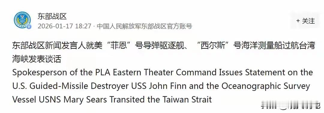 美国又来台海了,又在执行川普的“中国收台,我会不高兴”霸权路线,这种不办通行证“门票“,肆意来中国家门口“畅游”的卑劣行径,尤其美军携带军舰来“逛台海”,中国绝对不能坐视任其肆意妄为。 东部战区最新消息,1月16日至17日,美“菲恩”号导弹驱逐舰、“西尔斯”号海洋测量船过航台湾海峡。中国人民解放军东部战区,组织海空兵力对美舰过航行动全程跟监警戒,有效应对处置。中国军队诚然表明时刻准备,坚决捍卫国家主权安全和地区和平稳定的决心,但对美国危险做法,绝不可掉以轻心,常态化应对了之。 台湾自古是中国土地,川普既然也承认台湾是中国的,那么也就是认可台湾海峡就是中国管辖的内海,做事必须讲点规矩,尤其美国来礼仪之邦中国,打此过可以,但必须向中方报备许可方可以通行,非法通过可是中国也是非常不高兴的!执意这样做肯定也是要付出代价的。 二来口口声声要与中国交好的美国,这样做无疑给敌视中国的极少数国家,释放出一种极不友好的信号,也变相的起到一个很坏的示范效应,美国“狐朋狗友”必将会跟风“游台海”!这哪里是过境台海,纯属来中国示威,这样挑衅不亚于言语威胁! 尤其国家加速推进统一的今天,这是中国绝对不希望看到的,军舰耀武扬威过台海,其实就是给“台独分子“打气壮胆”,这样看绝不可以全程跟踪警戒应对,似乎缺乏点力度和信心。这也表明考验中国智慧和胆识机会到了!