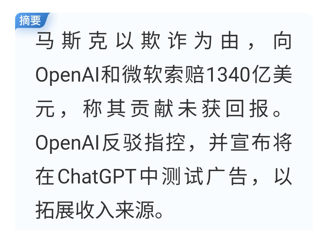 索赔9300亿,马斯克与OpenAI的巨大商业纠纷,将为国产AI产业链带来安全性和稳定性价值凸显机遇,下周AI应用有望迎来修复机会。 全球首富、特斯拉CEO马斯克以“构成欺诈”为由,向OpenAI、微软索赔1340亿美元,折合人民币约9300亿元。 理由是2015年马斯克协助创立OpenAI时,向其捐赠了3800万美元种子资金,占其初创资金的60%份额,还协助招募员工,帮助创始人与关键人物取得联系,并在该项目创立之初为其增添了可信度。而其创始人曾承诺 OpenAI不以商业化盈利为目的,但是现在来看马斯克却遭到欺诈,因此马斯克认为自己有权获得OpenAI当前5000亿美元估值中的相应部分。 消息称马斯克团队已经准备好了所有资料并已提起诉讼,加州奥克兰市的一名法官本月裁定,将由陪审团来审理此案,预计将于4月开庭。 这个事件可谓是AI界又一震撼性事件,将对国内AI产业链相关股价短期产生一定刺激。 根据以往经验,海外科技巨头遭遇巨额处罚或者诉风险时,国产替代都会被短期催化,走一波国产替代逻辑性上涨。 而这次马斯克对OpenAI、微软的诉讼有可能引发市场对海外巨头商业纠纷和不确定性的担忧,从而促使市场更加关注国内自主可控的AI产业链,国内大模型、算力、应用软件的价值和安全性将被进一步凸现。 结合周末央广网对AI应用和商业航天方向的定性发声:都是国家重点支持的高科技领域,不是不让炒,而是不能乱抄那些没有任何实质性东西,只靠互动内容含糊其辞蹭概念的假航天、假AI。以上两个事件的发生,相信下一周将会刺激AI方向迎来比较可观的修复机会。 具体如何发展,还是以盘中客观走势为准,以上预判不作为投资建议。