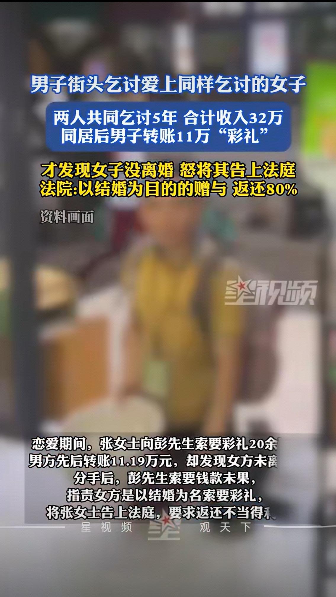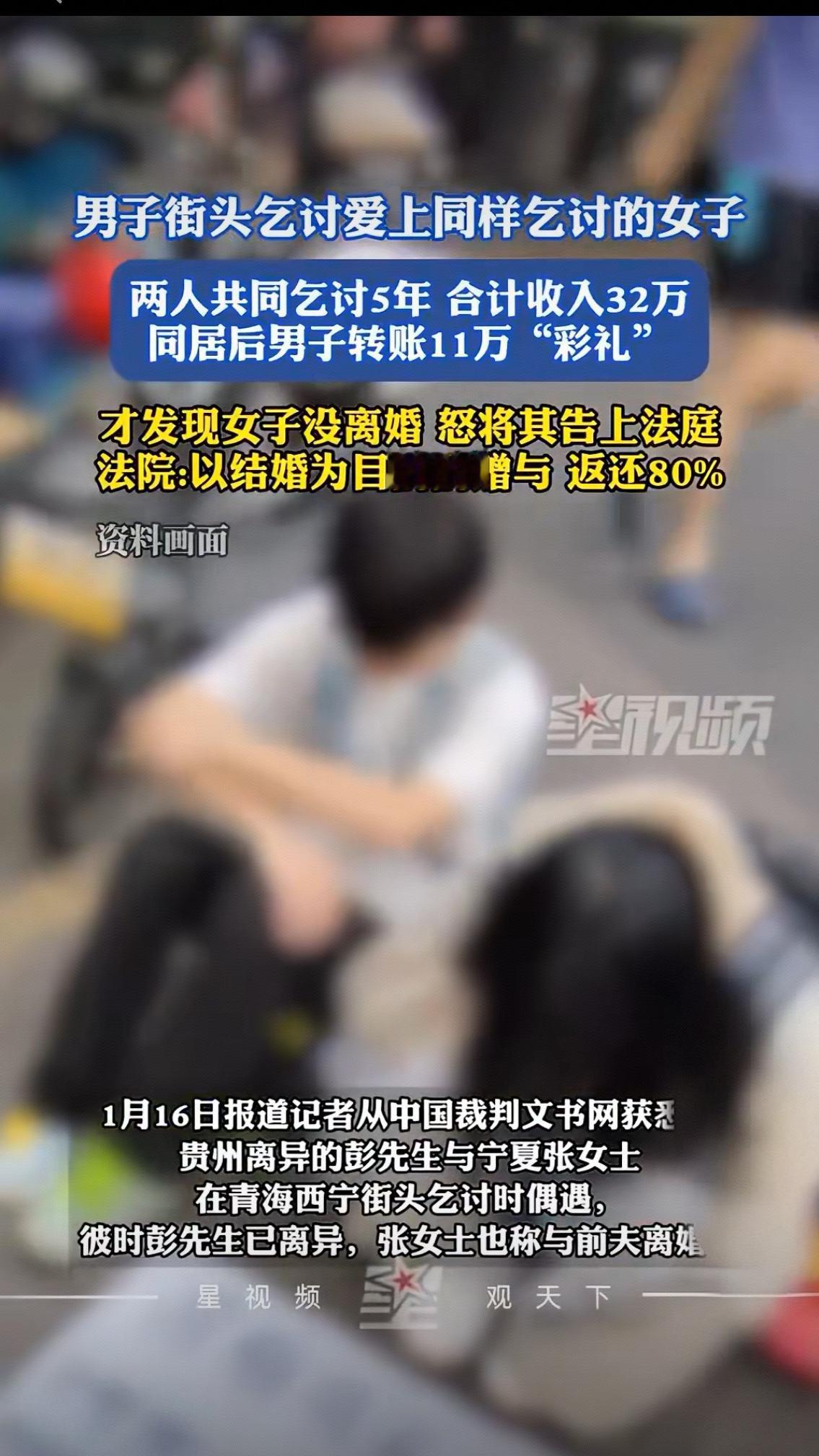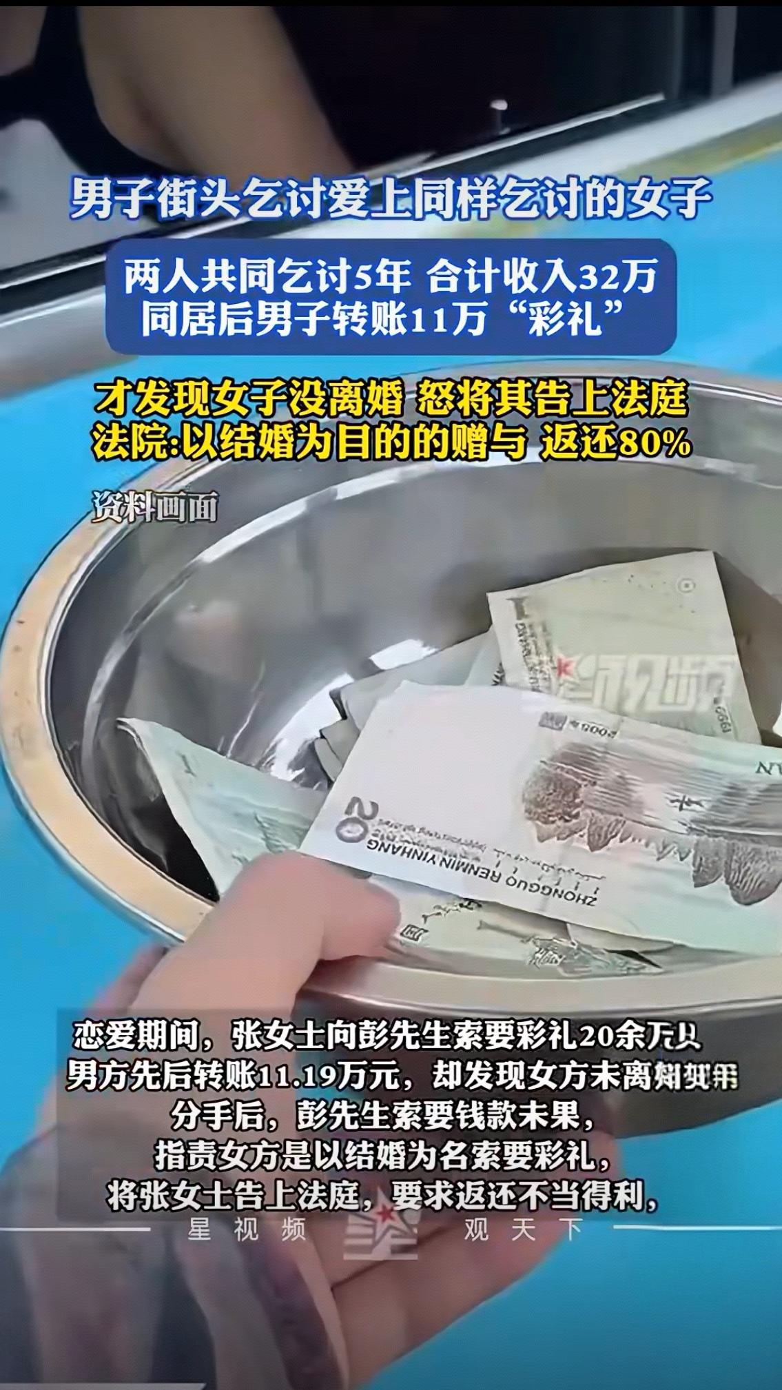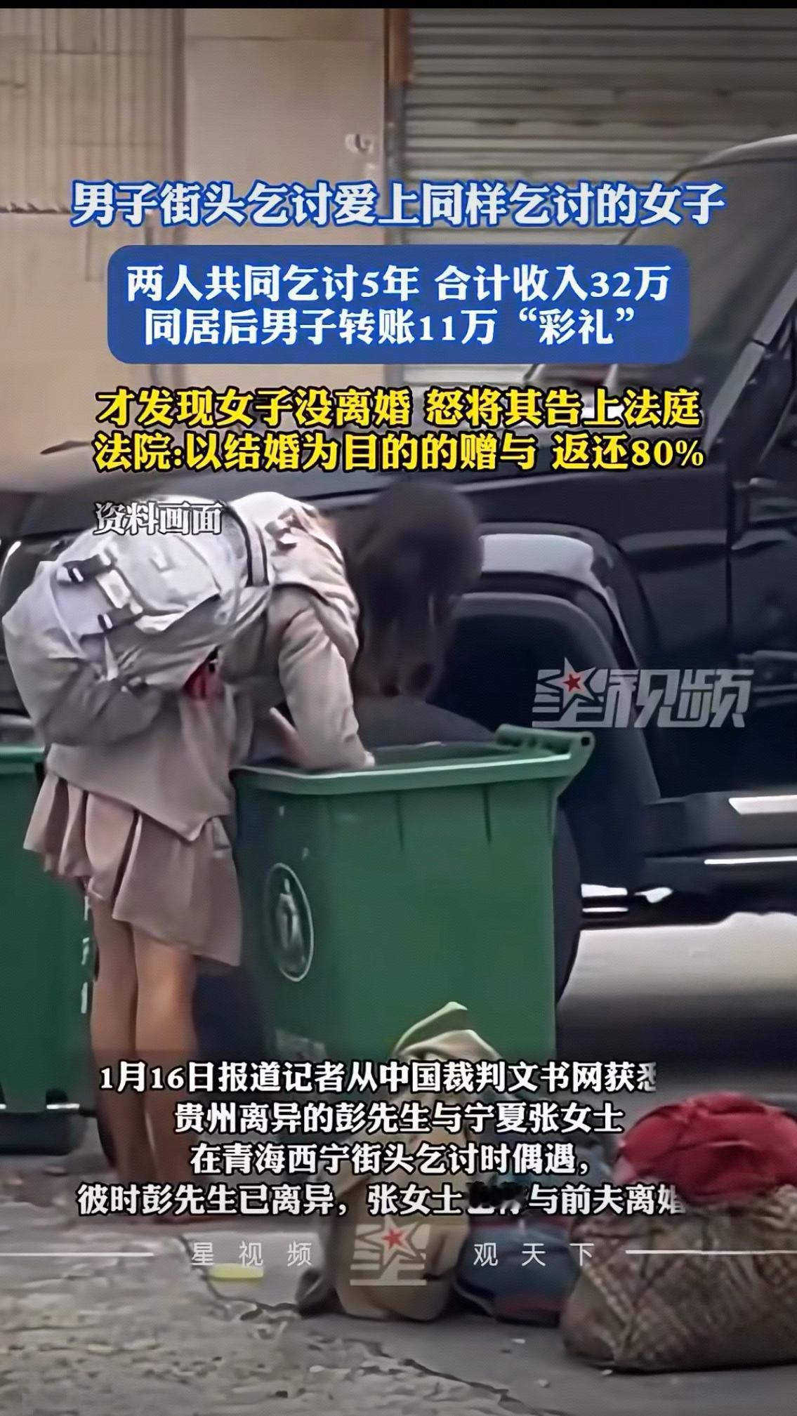 乞讨5年攒32万,11万彩礼喂了谎言!底层爱情为何容不下真诚? 贵州离异的彭先生与宁夏张女士,在青海西宁街头乞讨时偶遇,彼时彭先生已离异,张女士也称与前夫离婚。相似的漂泊境遇,让两个在寒风中乞讨的人迅速抱团——夏天顶着四十度高温守在路口,冬天蜷缩在地下通道相互取暖,捡别人丢弃的面包果腹,穿洗得发白的二手衣物,每天收摊后在桥洞下逐一清点零钱,一毛一块地攒着“安家费”。谁能想到,这对看似窘迫的乞讨情侣,五年间竟合计收入32万元,月均超5300元,远超不少三四线城市的普通上班族。 这份用路人同情心攒下的“血汗钱”,成了彭先生奔赴爱情的底气。2024年7月,在张女士索要20万彩礼的要求下,他毫无保留地先后转账11.19万元,满心盼着能领张结婚证,给这段“患难情缘”一个名分。可现实却给了他最残忍的一击:感情破裂后,彭先生意外发现,张女士的婚姻关系从未解除,所谓的“离异”不过是一场精心编织的骗局。 愤怒的彭先生将张女士告上法庭,可庭审中的辩解更让全网哗然。张女士拒不承认彩礼说法,辩称这11万是“共同乞讨的分成”和“照顾他的保姆费”,却拿不出任何记账凭证或书面约定。反观彭先生提交的转账记录、聊天记录,清晰证实了款项是“以缔结婚姻为目的的赠与”。最终二审法院判决张女士返还80%,即89536元,维持原判。 这场闹剧之所以引爆舆论,藏着太多颠覆认知的反差:乞讨5年挣32万,打破了“乞讨者必贫困”的刻板印象,暴露了职业乞讨的灰色利益链;两个本该抱团取暖的底层人,却上演“底层互害”的戏码,让人心寒。更值得深思的是,张女士隐瞒婚姻、以夫妻名义同居,已涉嫌重婚罪和诈骗罪,却仅以民事纠纷处理,80%的返还比例也让网友质疑“是否太宽容”。 有人说,彭先生的遭遇是“痴情错付”,可谁能体会一个离异乞讨者对家的渴望?他掏出的不是简单的彩礼,是五年风餐露宿攒下的全部信任。而张女士输掉的,何止是8万多块钱,更是底层人最该珍视的真诚。这件事也给所有人提了醒:无论身份高低、收入多少,诚信都是立身之本;恋爱中大额转账务必核实对方情况,留存证据,别让真心喂了谎言。 你觉得80%的返还比例合理吗?职业乞讨该如何规范?欢迎在评论区聊聊你的看法!乞讨