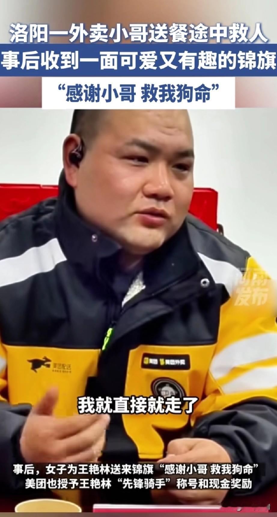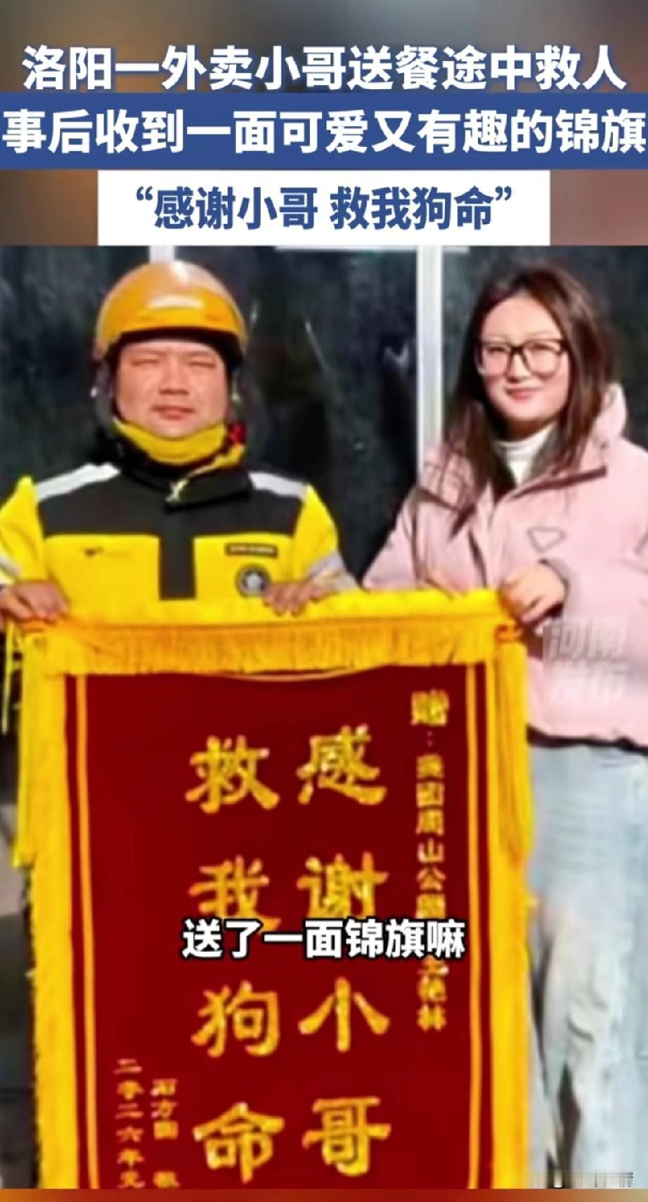 洛阳外卖小哥送餐途中救人, 女子获救后感谢外卖小哥, 给他送了一面羞于启齿的锦旗, 内容写着感谢小哥,说救我狗命! 小哥拿到旗帜的时候都被逗笑了, 丑团也奖励了小哥先锋骑手的称号和现金,可以说这些都非常的暖心, 既鼓励了骑手, 又温暖了人心, 媒体的报道也非常棒! 小哥表示自己当时什么也没想, 只想着赶紧救人, 小姐姐也是幸运, 幸亏遇到了外卖小哥, 否则真的要出大事, 还是好人多! 洛阳 外卖哥感动瞬间 外卖哥见义勇为 外卖员救人事迹 外卖员救人