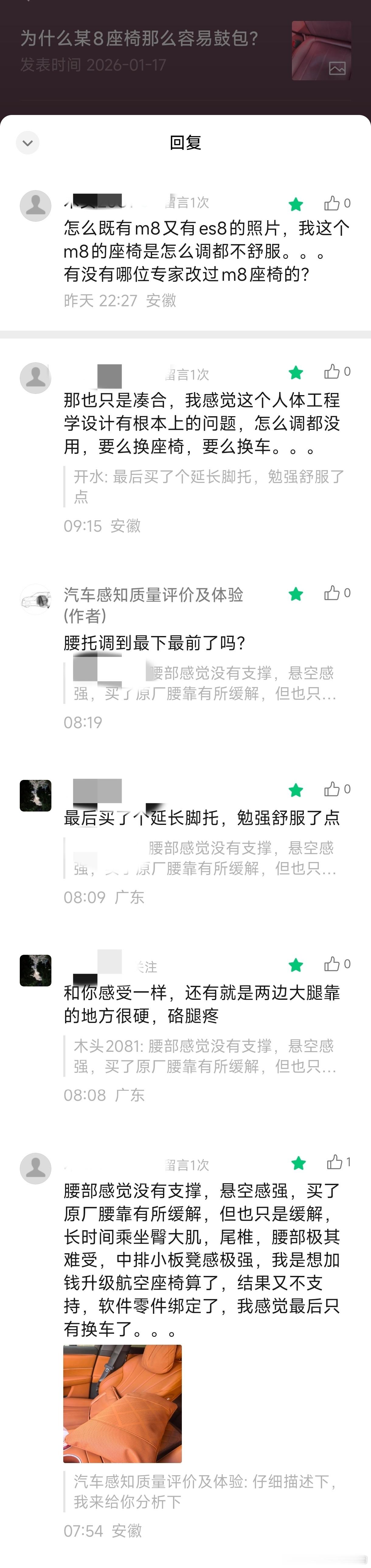 某8用户抱怨座椅舒适性不好【具体描述】腰部感觉没有支撑,悬空感强,买了原厂腰靠有所缓解,但也只是缓解,长时间乘坐臀大肌,尾椎,腰部极其难受,中排小板凳感极强,我是想加钱升级航空座椅算了,结果又不支持,软件零件绑定了,我感觉最后只有换车了。。。希望某品牌可以看到,改进我不说也不代表用户感知不到,客观问题在那里摆着就像第一代某9的电子开门按键易误触发开门一样,我说了,带来的是你们xx我,你们的用户网上那么多抱怨自己看到了,第二代车型某8不是改小了,往里沉了吗?还有很多这样的案例,你们拿我提的问题来改进产品,反过来xx我让我想到了【东郭先生】