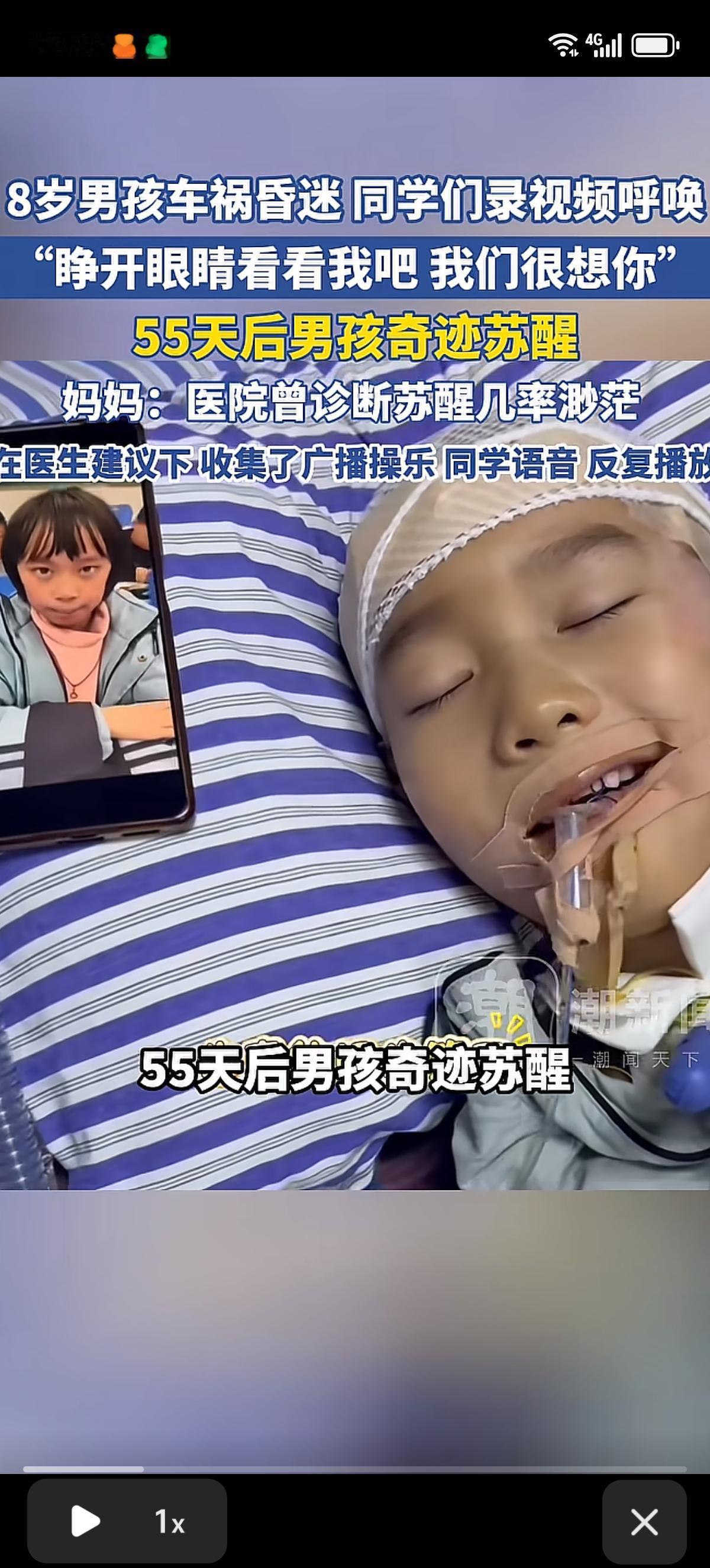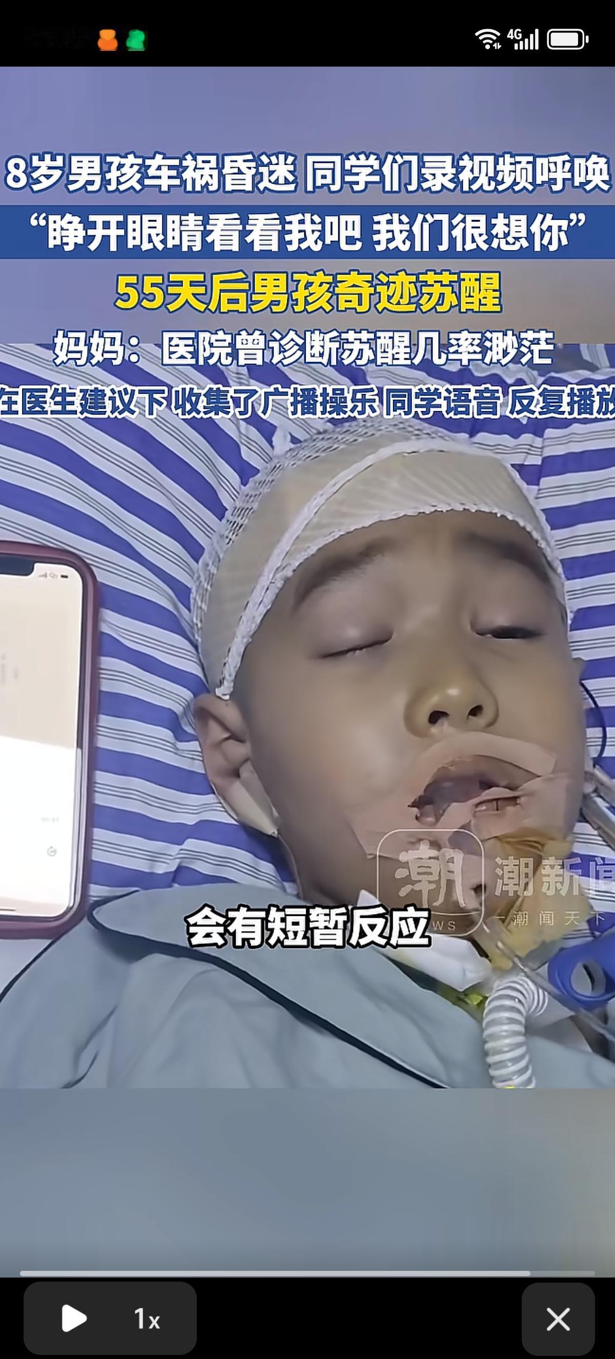8岁男孩上学路上遭遇车祸,头部重伤导致深度昏迷,同班同学们录视频呼唤他“睁开眼睛看看我吧,我们很想你”,直到跨年夜听到同学分享的歌曲时短暂睁开了眼睛。 此后这个湖南长沙的男孩听到同学们的声音,开始有短暂的反应,或微笑,或动动手指。在医生的建议下家长还收集了学校广播体操音乐给儿子反复播放! 在医院诊断苏醒几率渺茫的55天后,男孩奇迹苏醒,恢复了意识,可以简单跟家人交流了。
