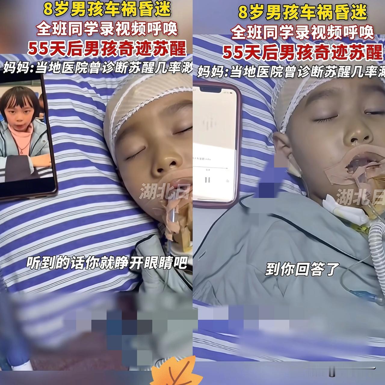 “泪目了!”湖南长沙,一位8岁半的男孩,遭遇车祸后昏迷,醒来的几率微乎其微。父母咬牙不放弃,转院救治寻生机,靠着全班同学的暖心呼唤,55天后生命奇迹真的来了! 听医生建议,用熟悉声音刺激大脑,妈妈立刻联系老师,集齐学校起床乐、广播操乐,还有全班同学的加油音视频,日夜在病房循环播放。 从起初毫无回应,到跨年当天闻声睁眼,再到听见同学喊话嘴角漾出笑意,每一步都揪着人心! 这哪是偶然的奇迹,分明是母爱执念与同窗温情,合力唤醒的生命力量!世间最动人的从来都是不放弃的坚守,再难的绝境,有爱的牵挂与坚定信念,就终能等到曙光! ​为坚强的男孩点赞,也为伟大的母爱和温暖的师生情致敬!愿每一个生命都能被温柔以待!男孩车祸昏迷55天苏醒 妈妈发声