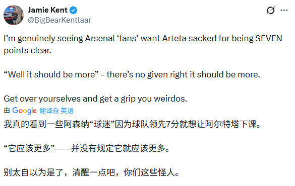 枪迷Jamie Kent:我真的看到一些阿森纳“球迷”因为球队领先7分就想让阿尔特塔下课。“它应该更多”——并没有规定它就应该更多。别太自以为是了,清醒一点吧,你们这些怪人。枪手博主kimmoFC转发留言:想象一下如果不败赛季有社交媒体会是什么样子?诺丁汉森林vs阿森纳 英超联赛 阿森纳