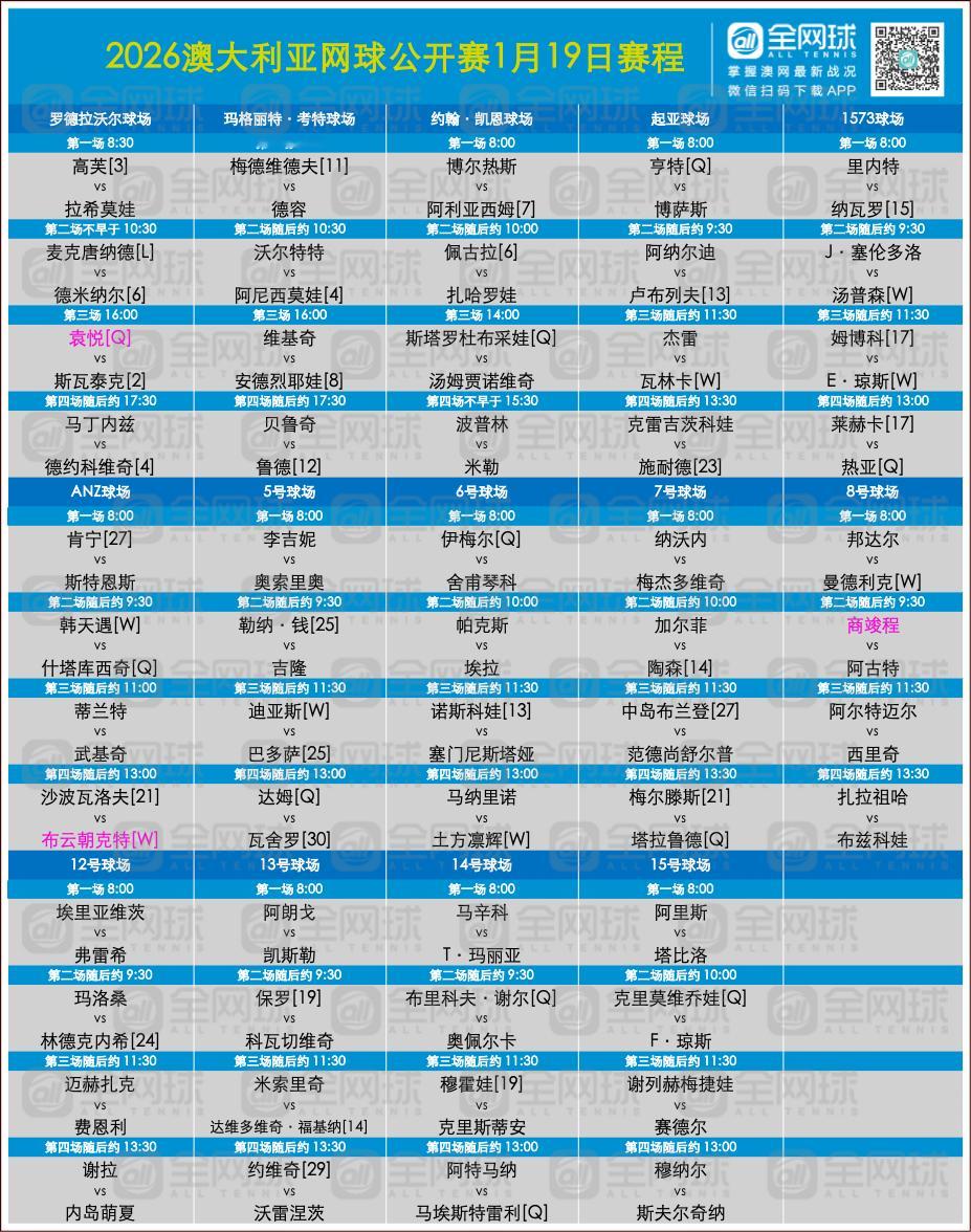 澳网第二比赛日赛程出炉(1.19周一)袁悦、商竣程、布云朝克特登场图这很澳网澳网2026网球