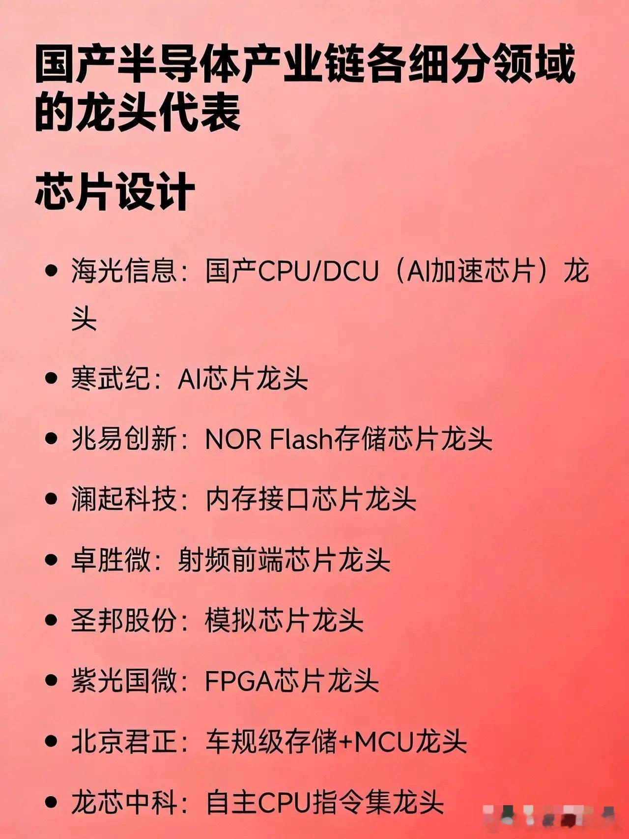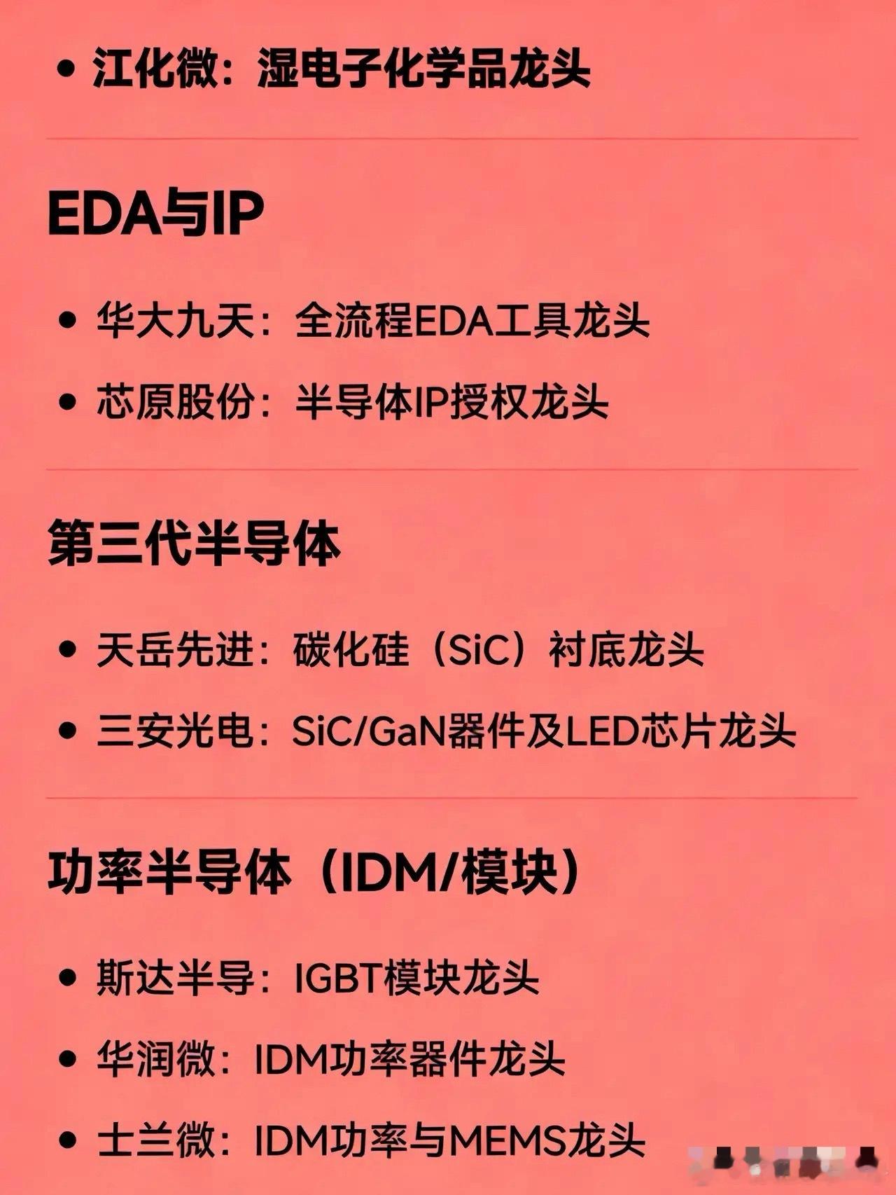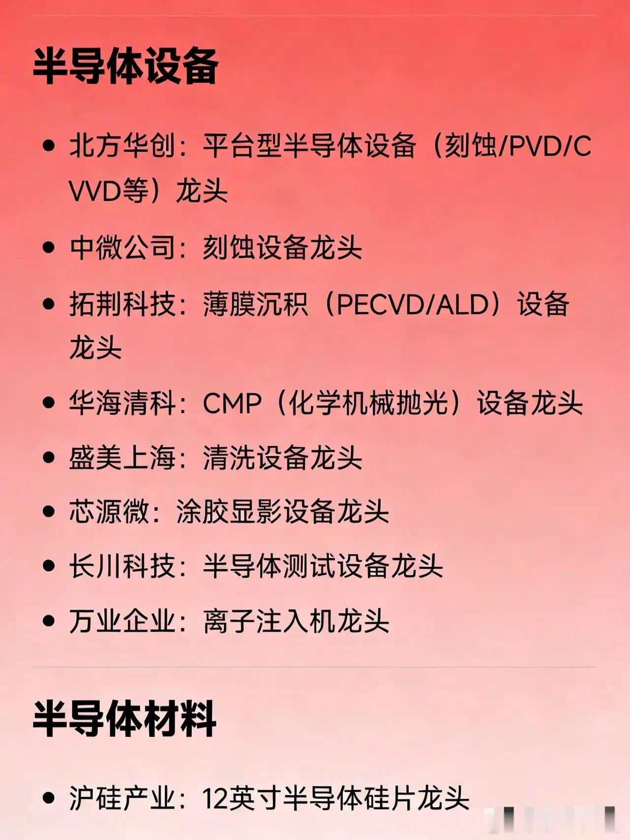 2026国产半导体产业链各细分领域的龙头代表芯片设计海光信息:国产CPU/DCU(AI加速芯片)龙头寒武纪:AI芯片龙头兆易创新:NOR Flash存储芯片龙头澜起科技:内存接口芯片龙头卓胜微:射频前端芯片龙头圣邦股份:模拟芯片龙头紫光国微:FPGA芯片龙头北京君正:车规级存储+MCU龙头龙芯中科:自主CPU指令集龙头景嘉微:GPU芯片龙头瑞芯微:边缘AI SoC芯片龙头东芯股份:中小容量存储芯片设计龙头豪威集团(韦尔股份):CIS图像传感器芯片龙头汇顶科技:指纹识别芯片龙头 晶圆制造(代工)中芯国际:先进制程晶圆代工龙头华虹公司:特色工艺(功率/嵌入式存储)代工龙头晶合集成:显示驱动芯片代工龙头 封装测试长电科技:先进封装(Chiplet等)龙头通富微电:AI芯片封测龙头华天科技:汽车电子封测龙头晶方科技:CIS芯片封测龙头佰维存储:存储芯片封测龙头深科技:闪存封测龙头 半导体设备北方华创:平台型半导体设备(刻蚀/PVD/CVD等)龙头中微公司:刻蚀设备龙头拓荆科技:薄膜沉积(PECVD/ALD)设备龙头华海清科:CMP(化学机械抛光)设备龙头盛美上海:清洗设备龙头芯源微:涂胶显影设备龙头长川科技:半导体测试设备龙头万业企业:离子注入机龙头 半导体材料沪硅产业:12英寸半导体硅片龙头TCL中环:大尺寸单晶硅材料龙头南大光电:ArF光刻胶龙头彤程新材:KrF光刻胶龙头上海新阳:高端光刻胶及配套材料龙头安集科技:抛光液龙头鼎龙股份:抛光垫龙头江丰电子:高纯溅射靶材龙头雅克科技:电子特气+前驱体龙头华特气体:光刻气龙头阿石创:PVD镀膜材料龙头江化微:湿电子化学品龙头 EDA与IP华大九天:全流程EDA工具龙头芯原股份:半导体IP授权龙头 第三代半导体天岳先进:碳化硅(SiC)衬底龙头三安光电:SiC/GaN器件及LED芯片龙头 功率半导体(IDM/模块)斯达半导:IGBT模块龙头华润微:IDM功率器件龙头士兰微:IDM功率与MEMS龙头闻泰科技(安世半导体):车规级功率半导体龙头