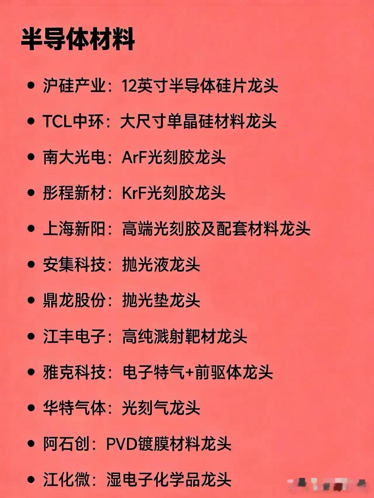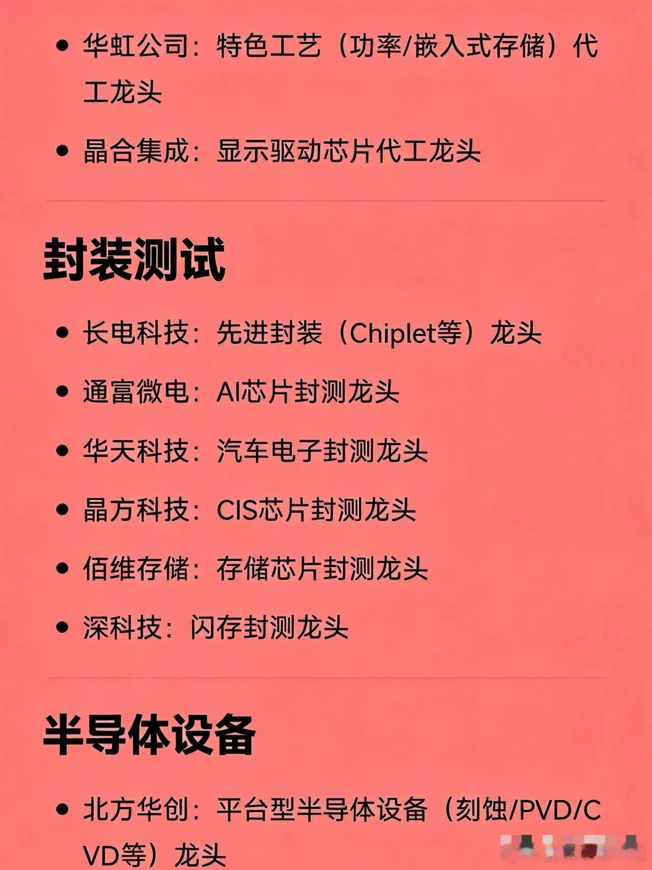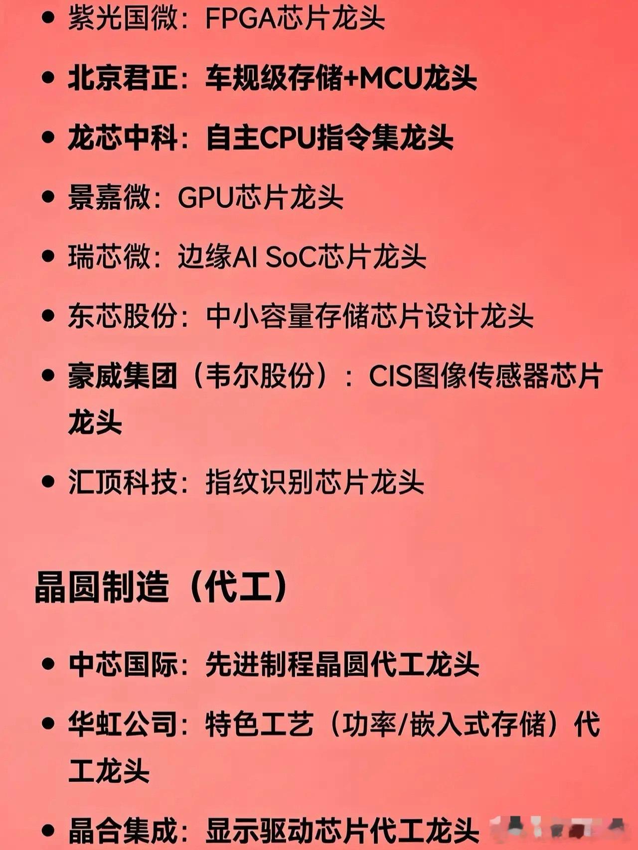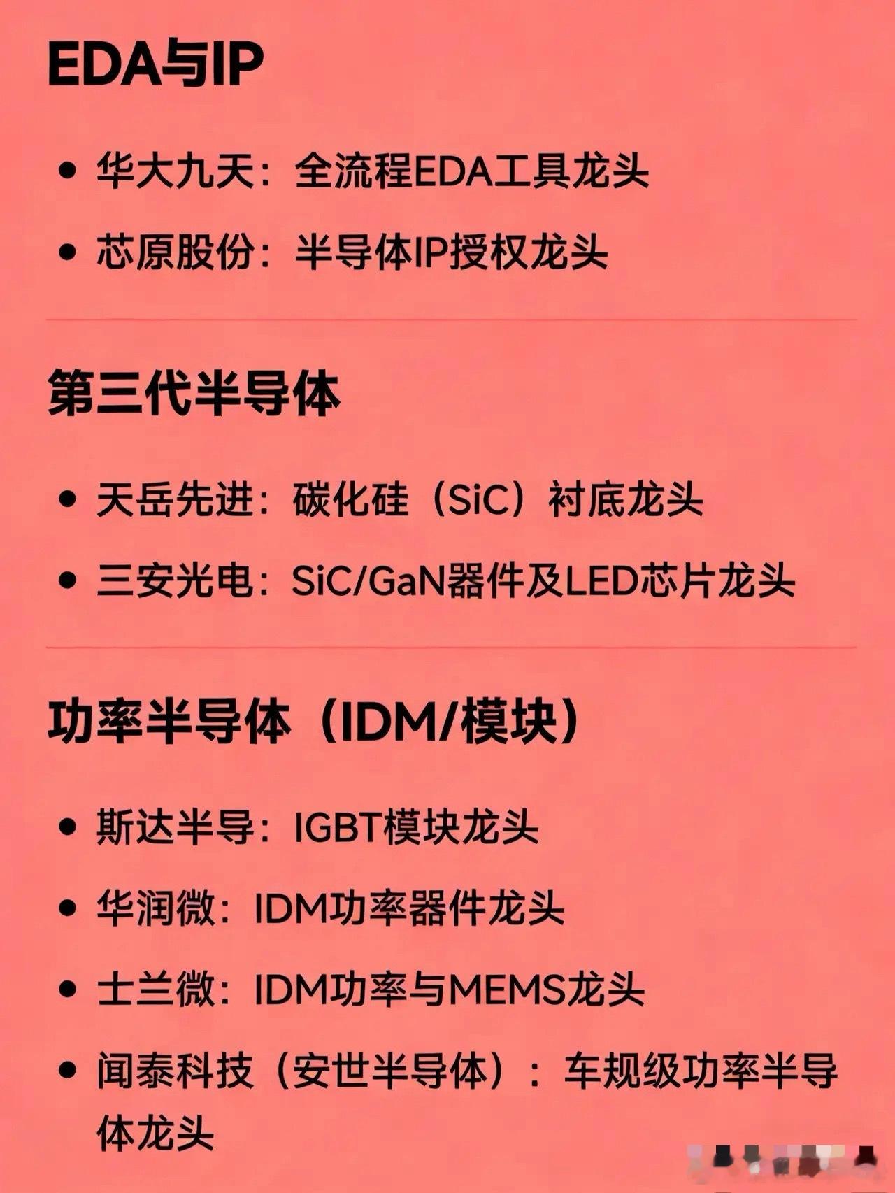 2026国产半导体产业链各细分领域的龙头代表芯片设计海光信息:国产CPU/DCU(AI加速芯片)龙头寒武纪:AI芯片龙头兆易创新:NOR Flash存储芯片龙头澜起科技:内存接口芯片龙头卓胜微:射频前端芯片龙头圣邦股份:模拟芯片龙头紫光国微:FPGA芯片龙头北京君正:车规级存储+MCU龙头龙芯中科:自主CPU指令集龙头景嘉微:GPU芯片龙头瑞芯微:边缘AI SoC芯片龙头东芯股份:中小容量存储芯片设计龙头豪威集团(韦尔股份):CIS图像传感器芯片龙头汇顶科技:指纹识别芯片龙头 晶圆制造(代工)中芯国际:先进制程晶圆代工龙头华虹公司:特色工艺(功率/嵌入式存储)代工龙头晶合集成:显示驱动芯片代工龙头 封装测试长电科技:先进封装(Chiplet等)龙头通富微电:AI芯片封测龙头华天科技:汽车电子封测龙头晶方科技:CIS芯片封测龙头佰维存储:存储芯片封测龙头深科技:闪存封测龙头 半导体设备北方华创:平台型半导体设备(刻蚀/PVD/CVD等)龙头中微公司:刻蚀设备龙头拓荆科技:薄膜沉积(PECVD/ALD)设备龙头华海清科:CMP(化学机械抛光)设备龙头盛美上海:清洗设备龙头芯源微:涂胶显影设备龙头长川科技:半导体测试设备龙头万业企业:离子注入机龙头 半导体材料沪硅产业:12英寸半导体硅片龙头TCL中环:大尺寸单晶硅材料龙头南大光电:ArF光刻胶龙头彤程新材:KrF光刻胶龙头上海新阳:高端光刻胶及配套材料龙头安集科技:抛光液龙头鼎龙股份:抛光垫龙头江丰电子:高纯溅射靶材龙头雅克科技:电子特气+前驱体龙头华特气体:光刻气龙头阿石创:PVD镀膜材料龙头江化微:湿电子化学品龙头 EDA与IP华大九天:全流程EDA工具龙头芯原股份:半导体IP授权龙头 第三代半导体天岳先进:碳化硅(SiC)衬底龙头三安光电:SiC/GaN器件及LED芯片龙头 功率半导体(IDM/模块)斯达半导:IGBT模块龙头华润微:IDM功率器件龙头士兰微:IDM功率与MEMS龙头闻泰科技(安世半导体):车规级功率半导体龙头