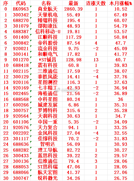 商业航天概念,一月以来涨幅最多的30名单汇总一览天银机电(300342):最新价 55.49元,连涨 1天,本月涨幅 67.49%臻镭科技(688270):最新价 195.40元,连涨 1天,本月涨幅 60.07%邵阳液压(301079):最新价 48.93元,连涨 1天,本月涨幅 54.79%信科移动-U(688387):最新价 19.81元,连涨 1天,本月涨幅 53.57%江顺科技(001400):最新价 117.29元,连涨 1天,本月涨幅 50.84%帝科股份(300842):最新价 87.54元,已连续上涨 4天,本月涨幅 47.70%流金科技(920021):最新价 9.75元,近期连续下跌2天,本月仍涨 幅45.09%和顺电气(300141):最新价 17.82元,连涨 1天,本月涨幅 41.77%ST铖昌(001270):最新价 *128.98元,已强势连涨13天,本月涨幅 40.70%**震有科技(688418):最新价 60.80元,连涨 1天,本月涨幅 39.83%