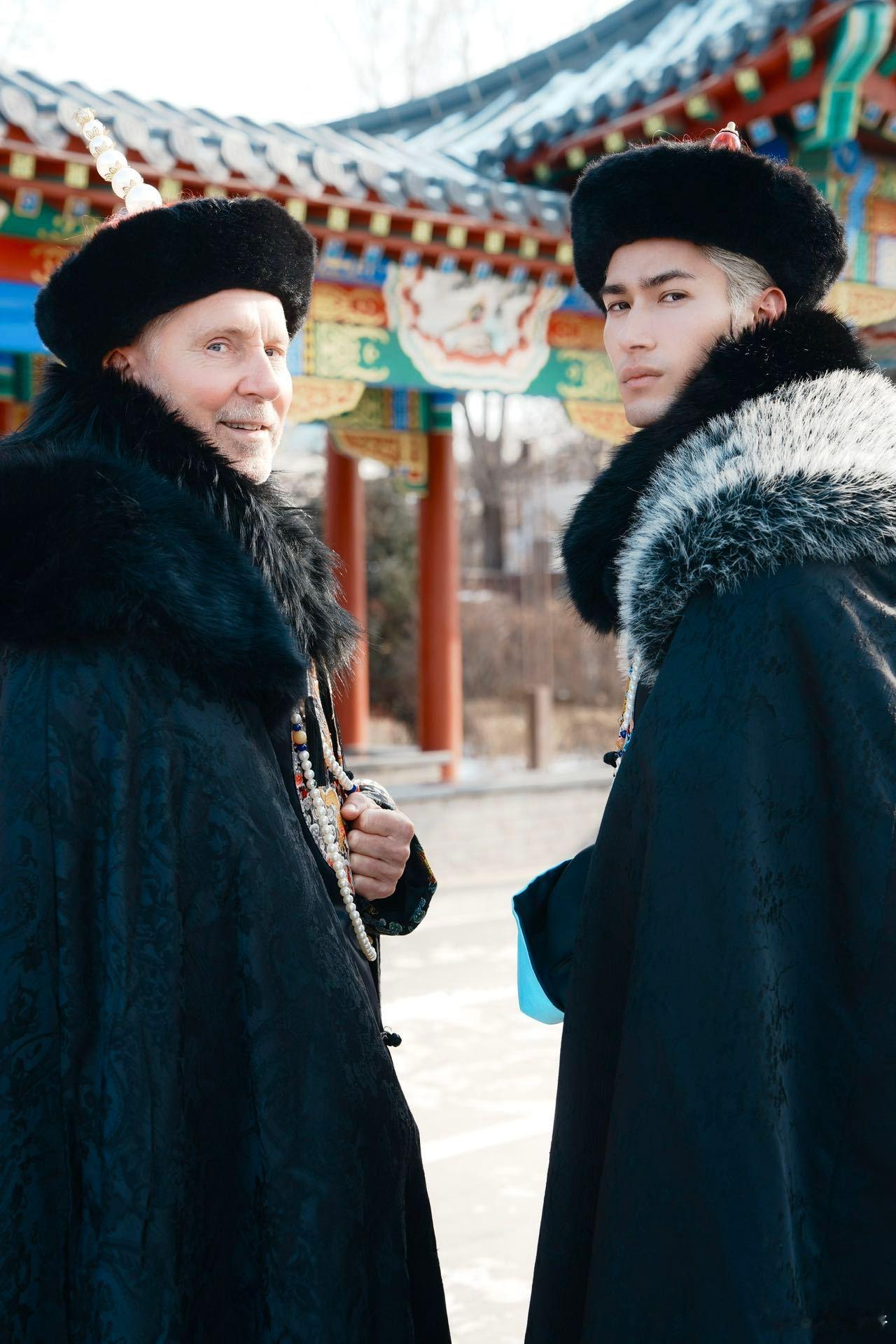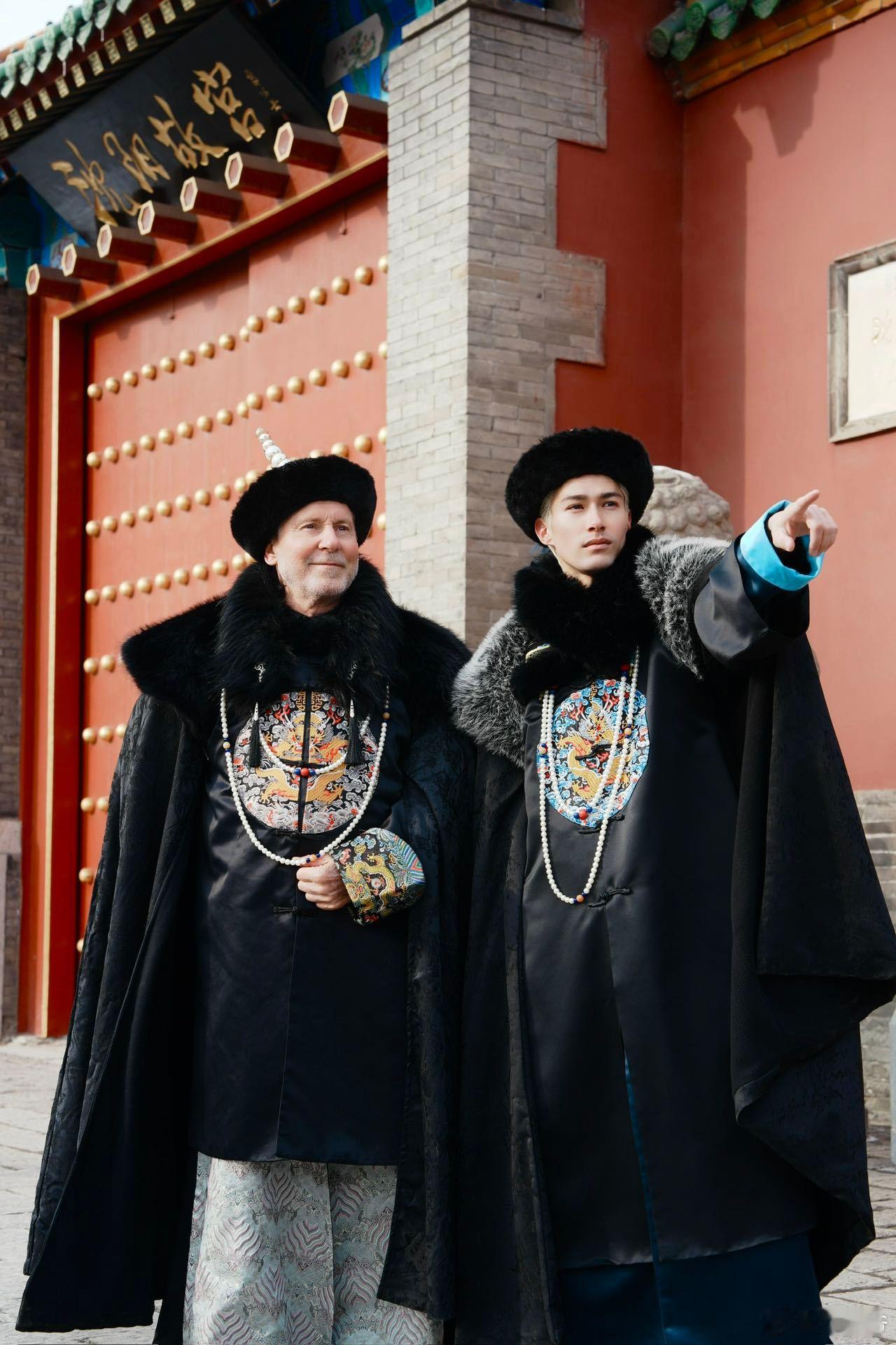 米卡带爸爸拍中国古风写真一老一小两个老外穿传统服饰站在沈阳故宫红墙下,画面也太有节目了!越看越觉得可爱,文化碰撞感拉满~
