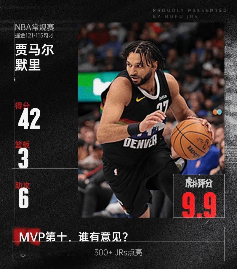 约老师的队友,并不CBA。 约老师缺阵9场,6胜3负。 今天,掘金再下奇才,121比115! 此战,穆雷表现出色,24中15,3分8中5,罚球8中7,42分3篮板6助攻2抢断2封盖。 数据无法体现他的强硬,关键时刻,不手软。 连续两个不讲理的3分,一个中投杀死比赛,真牛,必须进全明星啊! 这样子的穆雷,通常在4月份才能见到,现在提前了。 不过,不得不说,掘金这支队伍阵容厚度,太深厚了。 对比雷霆,掘金看起来更稳,他们的大王还没打呢。