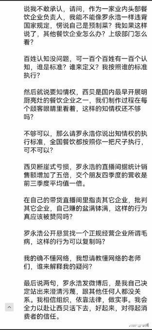 贾国龙还在喋喋不休的说预制菜,本来就对预制菜不感兴趣,现在看到他又立flag又拿国家标准说事!对西贝的预制菜只觉得满心厌恶!客户到你家店花那么多钱不是去吃料包加热的,你标准再国标又怎么了?东西好不好吃食物新不新鲜你家厨房有没有炒锅,消费者吃不出来吗?你说不是预制菜就不是预制菜啊! 真是此地无银三百两,西贝从来不预制!