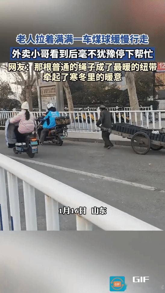 这样的架子车现在很少见了,但是在那个拖拉机还没有普及的年代,农村家家户户都有。看到老人拉着一车煤球,瞬间让我想到了父母。 当年农忙时节,他们就是这样在地里和家里来回穿梭,那背影真的很熟悉。 一架子车东西拉着有多沉,有多重,我是知道的,因为在老家拉过粮食,况且老人这个车还是加长的,可想而知有多累,有多费劲。 我觉得外卖小哥决定去帮忙时,肯定跟我一样,想到了自己的父亲、爷爷,感同身受,觉得必须要搭把手。 那一刻,帮老人就是在帮家里的父母长辈,心里是满足的,心情是愉悦的。大家说是吧? 内容来源:咿呀咿 山东