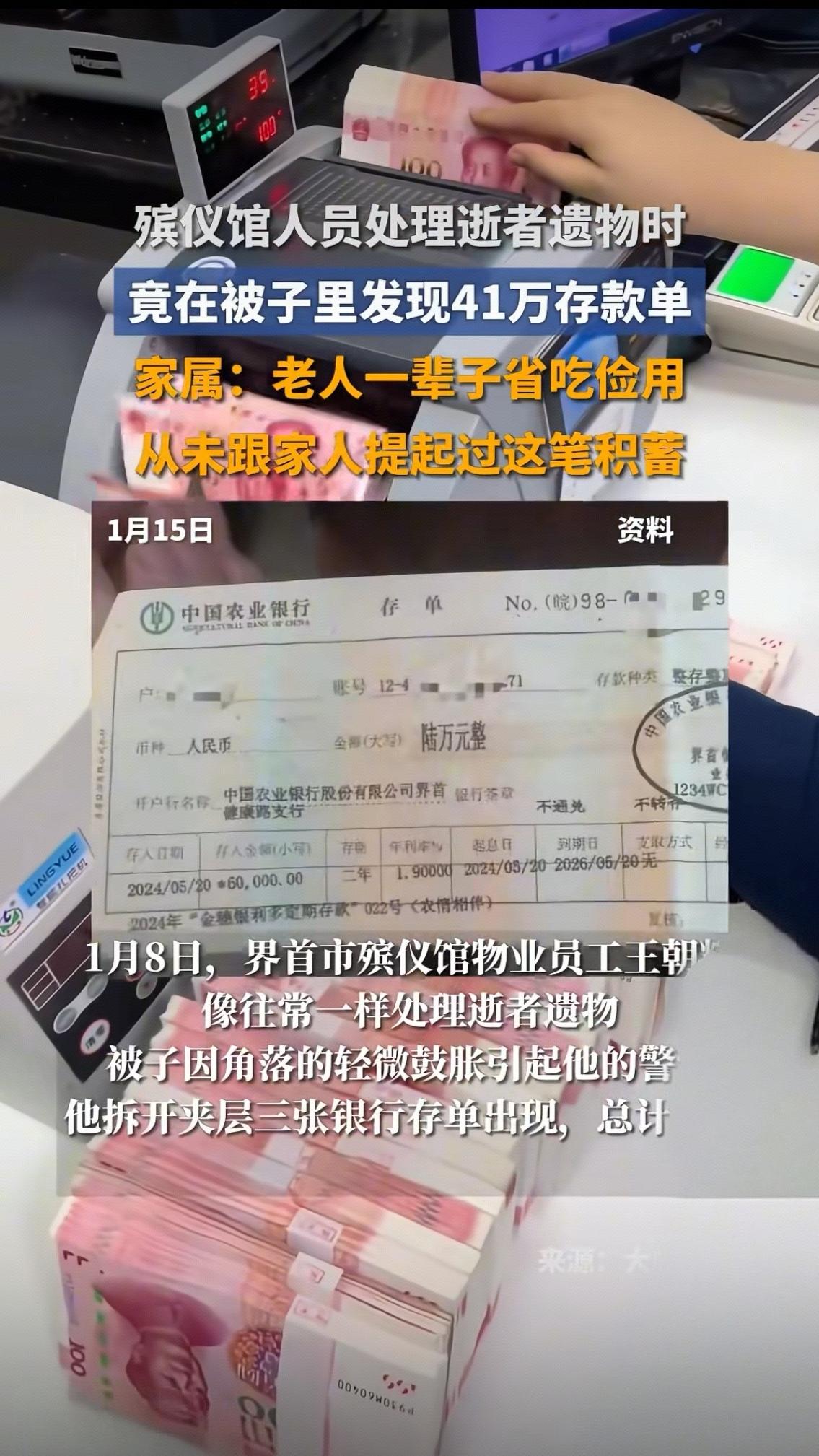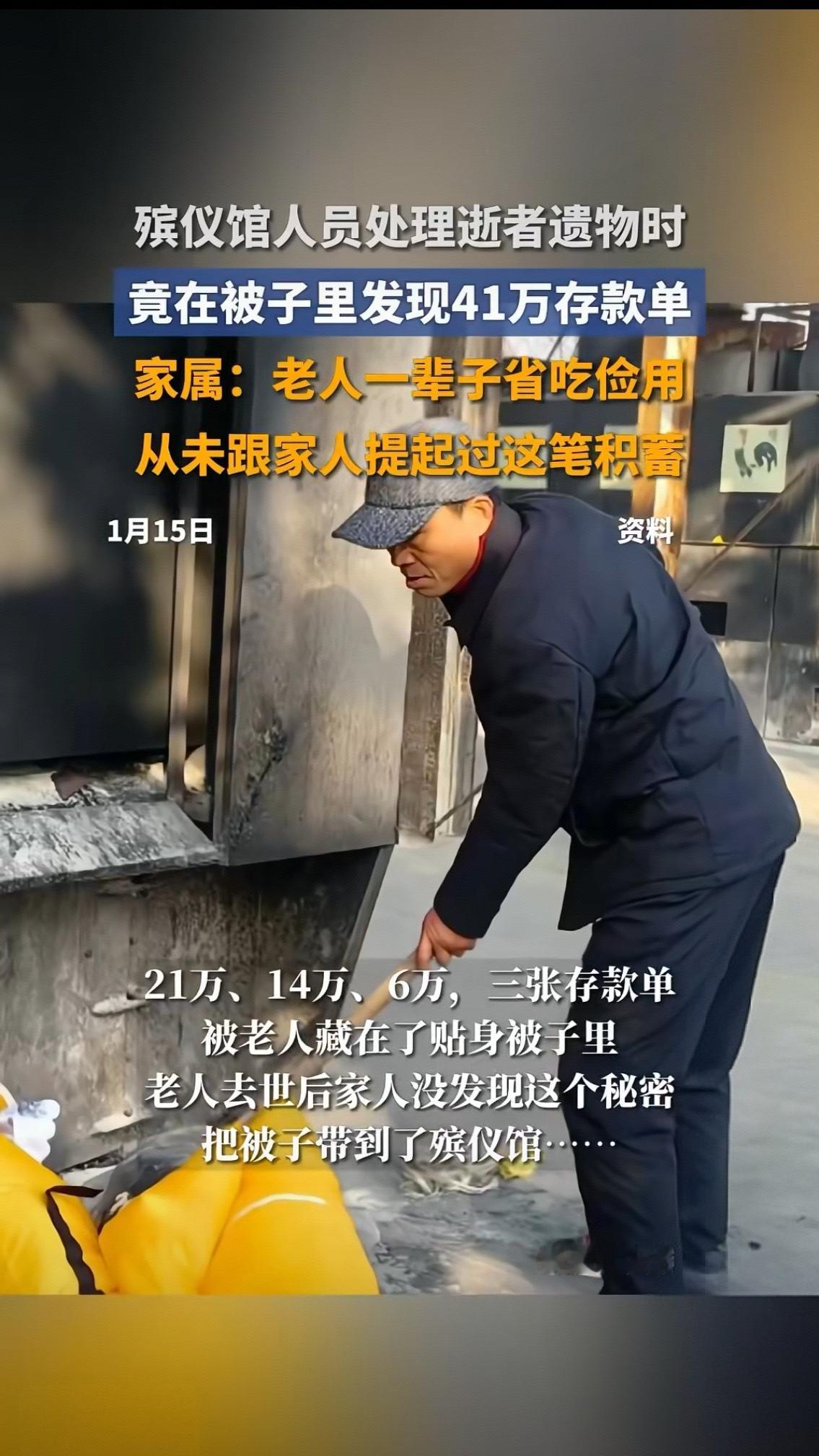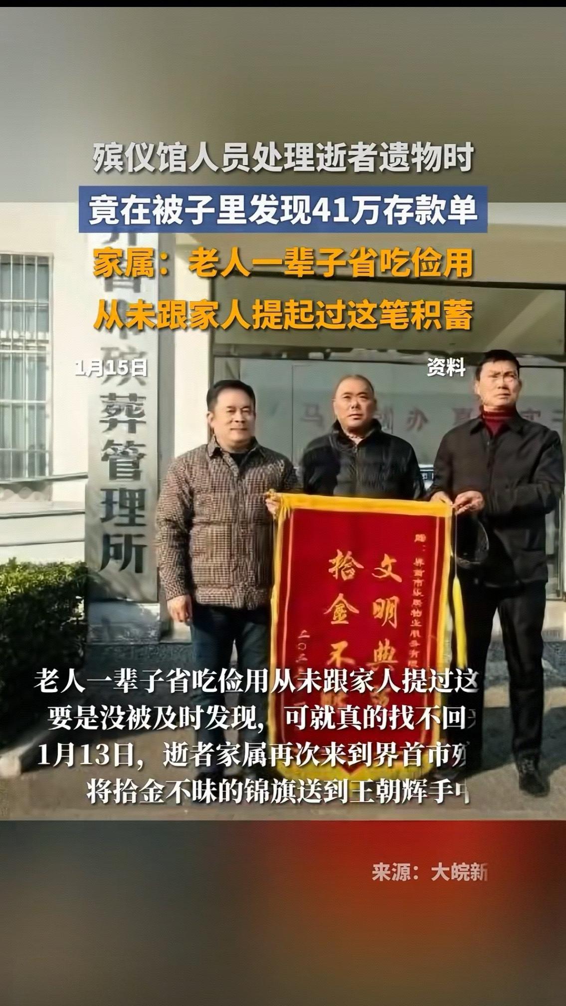 当王朝辉把绣着“拾金不昧 品德高尚”的锦旗紧紧攥在手里时,这个见惯了生死离别的殡仪馆工作人员,眼眶还是忍不住红了。谁能想到,1月13日这场特殊的致谢,缘起于一床寿被里的惊天秘密——三张总额41万的存款单,差点随着老人的遗体,永远尘封在告别厅里。 家属握着王朝辉的手反复道谢,话语里满是后怕与感激:“我爸一辈子省到骨子里,穿带补丁的衣服,吃最便宜的菜,连感冒药都舍不得买贵的,我们怎么也想不到他攒了这么多钱!”原来老人在世时,总说“钱够花”“不用你们惦记”,子女们只当是老人怕给他们添负担的客套话,直到整理遗物时都没多想,直接把贴身盖了十几年的旧被子送到了殡仪馆。 若不是王朝辉处理遗物时细心,发现被子夹层里硬邦邦的异物,若不是他没有丝毫私心,第一时间联系家属,这41万“救命钱”或许就成了永远的遗憾。要知道,对殡仪馆工作人员而言,处理遗物本是例行公事,可王朝辉却多了一份耐心与敬畏——他说:“每一件遗物都是逝者留给家人的念想,不能马虎。”这份朴素的坚守,让冰冷的殡仪馆里多了一束温暖的光。 而这41万存款单,更像一面镜子,照见了老一辈最动人的底色。他们经历过苦日子,把节俭刻进了骨子里,却把所有的爱都藏进了“抠门”的表象下。这不是吝啬,而是他们对抗生活的底气,是想在百年之后,还能给子女留一份保障的私心。可这份沉甸甸的爱,却常常因为“不善表达”,成了子女后知后觉的愧疚。 一边是拾金不昧的职业操守,一边是藏在存款单里的父爱如山。这场跨越生死的“交接”,不仅让我们看到了人性的光辉,更戳中了无数人的心:我们总忙着给父母物质回报,却忘了读懂他们沉默背后的深情。你家是否也有这样“嘴硬心软”的长辈?你是否也有过读懂父母心意后的瞬间泪目?欢迎在评论区聊聊你的故事~拾金不昧