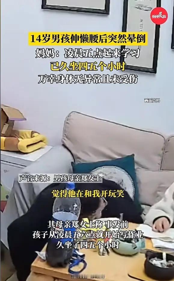 “太吓人了!”1月17日,湖南常德,一男生久坐学习后,起身伸懒腰时突然晕倒,先是跌坐在沙发上,脑袋不受控制地磕在茶几,妈妈还以为是男生不想学习,在开玩笑,直到男生身体倒在地上,才意识到问题严重性。网友:不要突然站起来! 男孩今年14岁,正在读初三,当天凌晨5点左右,天还没完全亮,他就已经起床开始写作业了。书桌上的作业堆得挺高,他一坐就是四五个小时,几乎没怎么动过地方。 上午10点多,男孩终于写完作业,想站起来伸个懒腰放松一下。他刚把胳膊举起来,突然感觉眼前一黑,整个人直接跌坐回沙发上,脑袋跟着就磕到了桌面,然后不受控制地滑倒在地上。 妈妈一开始还以为孩子在闹着玩,可能想用这种方式逃避学习。等她发现孩子脸色苍白、躺在地上一动不动,才意识到出大事了,赶紧冲过去扶起孩子,手都吓得发抖。 万幸孩子很快醒了过来,身体没有大碍,事后家人带他去医院检查,医生判断这是典型的“体位性低血压”。简单说就是坐得太久,血液都流到下半身,突然站起来时大脑暂时缺血,才会头晕眼花甚至晕倒。 长时间坐着不动,加上可能没来得及吃早饭喝水,容易引起低血糖或脱水,这些都会增加晕倒的风险。特别是正在长身体的学生,身体调节能力不如成年人,更需要注意。 不少家长留言说,自家孩子也有过类似经历,只是没那么严重,有时候站起来会说头晕眼花。孩子们学习压力大,经常一坐就是好几个小时,健康问题真的不能忽视。 学习固然重要,但身体健康才是基础,无论学习多忙,都要记得定时起来活动一下,伸伸腿脚、喝点水、吃点东西补充能量。站起来的时候动作别太猛,最好先稍微活动一下,再慢慢站起来。 各位读者你们怎么看?欢迎在评论区讨论。