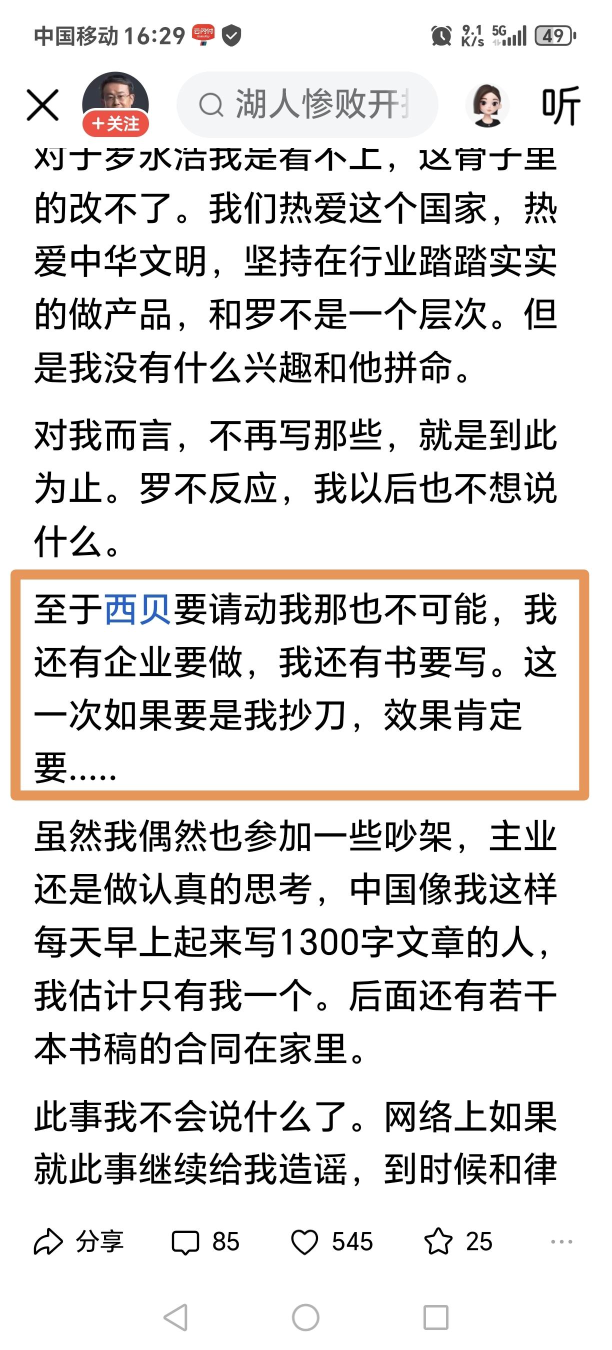 项立刚这分明是往自己脸上贴金,罗永浩与贾国龙之争,确实和你没什么关联!此前你连发5篇小作文抨击罗永浩,却毫无回应。我觉得罗永浩不理你,是根本瞧不上你。再者,以60亿身家在餐饮业排名第二的贾国龙,若要找人出谋划策,恐怕也轮不到你。你发文称若让你操刀,效果肯定如何如何,这未免太自吹自擂了!想蹭流量就蹭,别搞得这么……