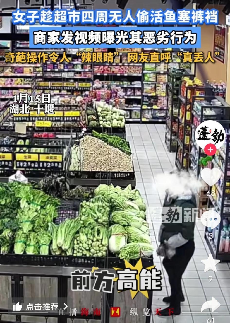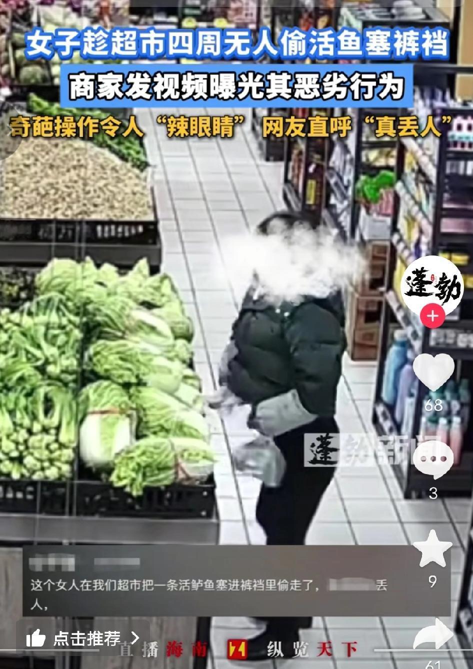 辣眼睛!海南女子超市偷活鱼塞裤裆,监控拍到鱼还在裤裆里扭动,店家气笑曝光,网友直呼“这鱼还能吃吗?真丢人”! 海南海口一家社区超市的生鲜区,午后的阳光透过玻璃照在青菜货架上,显得格外安静。一名穿着深色外套、戴着口罩的女子慢悠悠走了过来,她先是在油麦菜和上海青之间来回翻拣,手指看似在挑菜,眼睛却始终瞟着旁边的活鱼水箱。 她假装弯腰整理裤脚,余光扫了一圈——店员在远处理货,其他顾客都在水果区,生鲜区此刻空无一人。 说时迟那时快,她猛地直起身,左手迅速从水箱里捞起一条一斤多重的活鱼,右手拽起外套下摆,把鱼直接塞进了裤裆。冰凉的鱼身让她下意识地缩了一下腿,但她很快调整姿势,拽了拽衣角把鼓包遮住,又低头“挑”了两棵青菜,才故作镇定地走向收银台。 整个过程不到1分钟,监控画面里,那条活鱼在她裤裆里还在扭动,隔着屏幕都能感受到那份尴尬。 超市负责人盘点时发现活鱼少了一条,调看监控才看到这奇葩的一幕。“我们做了五年生意,偷菜偷肉的见过不少,但把活鱼塞裤裆的,真是开了眼!太恶心了!”商家又气又好笑,随即把监控视频发到网上,希望能找到这名女子,也警示其他顾客别效仿这种行为。 目前警方已经介入调查,该女子或将面临治安处罚! 网友评论 “这鱼是要贴身焐熟了带回家吗?太离谱了!” “为了这点小利连脸都不要了,真丢人!” “商家做得对,曝光她让大家看看这种人的丑态!” 还有网友说:“一条鱼不值钱,超市曝光视频是否太较真?” 为了一条活鱼做出如此不堪的举动,你觉得这种行为该被曝光吗? 女子偷活鱼塞裤裆 海南超市偷窃事件 奇葩行为 争议民生 来源:蓬 勃 新闻