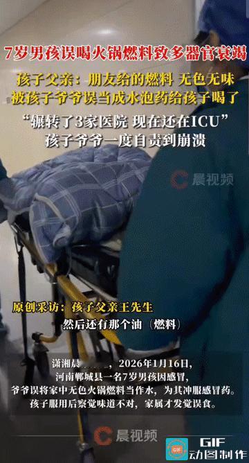 “天都塌了!”河南郸城,一七岁小男孩因感冒需要服药,爷爷误将装在矿泉水瓶中的火锅燃料当水使用,兑水冲感冒颗粒给孩子喝下,致其多器官衰竭,生命垂危! 来源:【潇湘晨报·晨视频】 1月16日早晨,轩轩(化名)因为感冒,爷爷想给他冲服感冒颗粒。家中饮水机没水,爷爷在角落里发现一个矿泉水瓶,以为是饮用水,便倒出一些加热后给孩子冲药! 轩轩喝了一口后说味道不对,爷爷尝了尝也觉得不对劲,立即打电话给儿子询问。电话那头传来的消息让老人如坠冰窟——那瓶“水”竟是火锅店用的无色矿物油燃料! 这瓶燃料是王先生从朋友火锅店拿回来的,准备在家吃火锅时使用。他特意将瓶子放在角落,却没有明确告知家人瓶中究竟是何物,更没想到会酿成如此大祸! 发现误饮后,爷爷尝试给孩子抠喉咙催吐,但轩轩没有吐出多少。在外工作的王先生得知消息后立即赶回家,带着孩子赶往当地医院! 病情发展迅速得令人窒息。不到一个小时,轩轩就开始呕吐,随后陷入昏迷,被诊断为急性肝衰竭、肾衰竭。医生建议他们立即将孩子转往郑州的省级医院抢救! 从县医院到市医院,再到省级医院,轩轩在短短一天内辗转三家医疗机构。当晚23点多,他终于被送入省级医院ICU! 此时,孩子已经无法说话,呼叫也无回应。医生检查发现他肝肾功能严重受损,随即开始进行透析等治疗! 截至1月17日晚21点,轩轩仍在ICU接受紧急抢救,依靠呼吸机与血液净化维持生命。他的家人无法进入ICU探视,只能焦急地等待消息! 医院方面已经告知王先生,孩子情况严重,“让我做好思想准备”。这句话让这位父亲瞬间崩溃,他在采访中反复表示“我当时心都碎了,天塌了”。 治疗费用已累计近6万元。对于这个家庭来说,这不仅是情感上的打击,也是经济上的沉重负担。王先生是一名辅警,这笔医疗费用对他的家庭来说无疑是巨大的压力! 事发后,爷爷陷入深深的自责,吃不下睡不着。这位老人原本只想照顾好生病的孙子,却因为一个可怕的误会将孩子置于生命危险之中! 王先生同样备受煎熬。那瓶燃料是他带回家的,虽然特意放在角落,却没有明确标识或告知家人,这一疏忽导致儿子命悬一线! 这起悲剧揭示了家庭中常见的化学品存放安全隐患。许多家庭习惯将非食用液体装在饮料瓶或矿泉水瓶中,这极易导致误食事件的发生! 尤其是与老人和孩子同住的家庭,更应该注意这类安全隐患。老人视力可能不佳,儿童好奇心强,他们都更容易误认容器中的内容物! 安全专家建议,家中所有非食用液体都应存放在原包装或明显标识的容器中,并放置在儿童无法触及的地方。同时,应明确告知所有家庭成员这些物品的危险性和存放位置! 家庭安全意识的缺失,让一瓶本应带来温暖的火锅燃料,变成了威胁孩子生命的毒药!