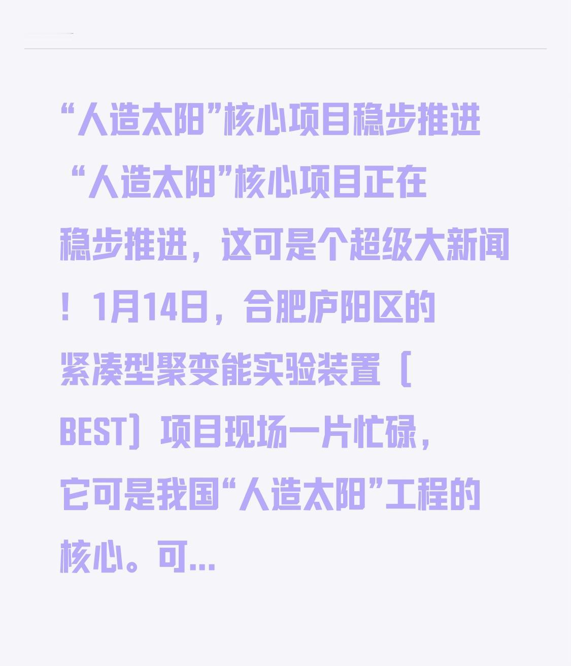 “人造太阳”核心项目稳步推进“人造太阳”核心项目正在稳步推进,这可是个超级大新