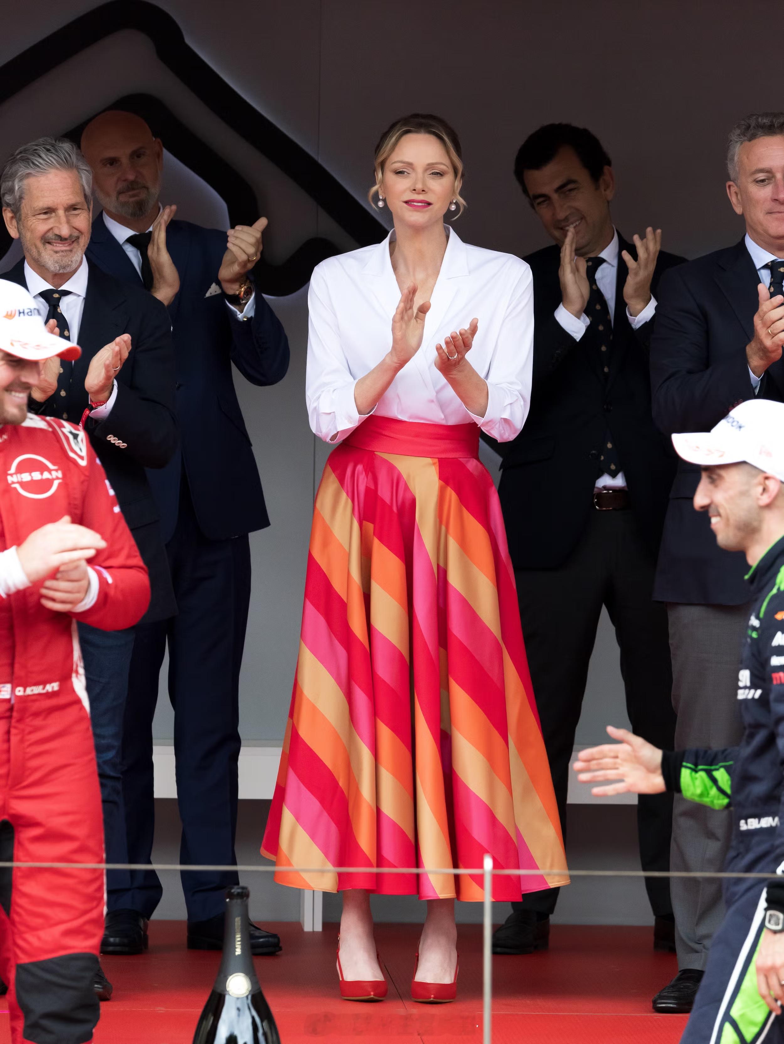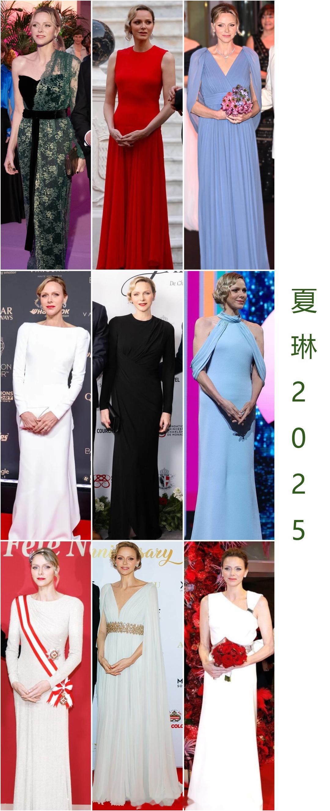 2025王室总结 摩纳哥王妃夏琳,去年穿奇怪连体裤的场子少了,礼服多为定制款,整体走温婉素雅的路线个人比较喜欢在玫瑰舞会上的不对称单肩绿纱袍子,日装选了套两件式艳色裙配白衬衫,最后再给多年不见的水花王冠一个镜头