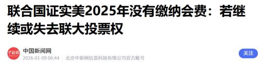 中国态度发生转变!2026年1月8日,联合国对美发出警告!联合国现金流已捉襟见肘,中国面对联合国要钱,态度变了! 联合国缺钱的问题并不是一时出现,而联合国之所以会出现这种经济困境,跟美国脱离不了关系。 美国长期拖欠联合国会费,而在美国的影响下,部分小国也跟随美国的举动。在多重因素的交织下,促使联合国现金流出现捉襟见肘的情况。 联合国经济困境在逐渐加剧的时候,联合国要求我国缴纳的会费比例也在持续增加。对于这一点我国能够理解,毕竟作为一个大国,我国一直在负责任。但是这并不意味着,联合国可以随意来我国的口袋里掏钱。 所以针对联合国的这一情况,2025年10月30日我国在缴纳联合国会费之后,就对此事进行表态。我国的态度已经非常明确,即便是联合国秘书长,副发言人用中文向我国政府表示感谢,也无法让我国对联合国改观。 或许也正因此,联合国对美的态度逐渐强硬,就在2026年1月9日的时候,联合国秘书长发言人对美国发出了一份警告。此人明确表示,美国若继续拖欠联合国会费,可能会在某个时候失去联合国大会的投票权。 联合国能够强硬的去对待美国,属实出人意料。根据相关宪章规定,一个会员国如果连续几年不缴纳会费,就可能会在某个时候失去联合国大会的投票权。而这也再次反映出来了,联合国的经济困境,已经让联合国喘不过气。 对此,您怎么看? (信息来源:联合国感谢中国缴清会费,美国已拖欠超30亿美元-羊城晚报·羊城派综合) (信息来源:联合国证实美2025年没有缴纳会费:若继续或失去联大投票权-中国新闻网)