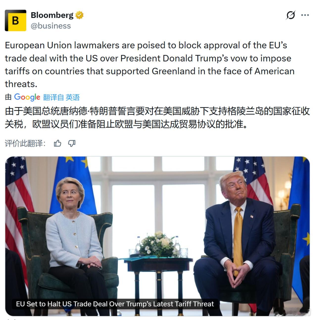 彭博社:欧盟议员准备阻止批准欧盟与美国的贸易协议,因为美国总统特朗普要对面对美国威胁而支持格陵兰岛的国家征收关税。美国收割中国的能力不行,但是宰割美国盟友的能力不进行,而且很行!
