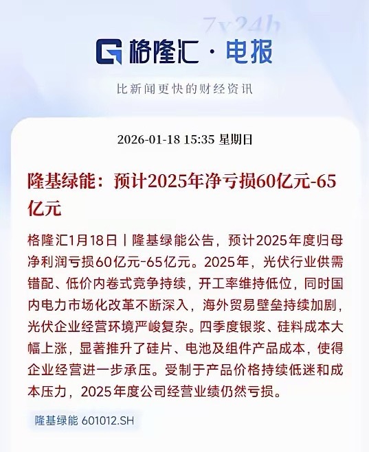 周末,光伏龙头业绩出来了,光伏板块出现重大利空,周一光伏难了隆基发布了2025年业绩报告,2025年亏损60亿-65亿元,业绩完全不及预期,机构此前预测隆基2025年业绩亏损为归母净利一致预期约37.92亿元,区间多在-21.59亿元至-51.06亿元。光伏本来今年已经加入了“反内卷”的行业,行业也确实出现了一定回升,尤其是多晶硅还出现了涨价的情况。资本市场表现的更加明显,光伏板块2025年上涨37.09%,2026年开年也一直在涨。没想到最后隆基的业绩大亏损会出现,这会让光伏短期内出现承压情况了,周一预计会带崩整个板块。