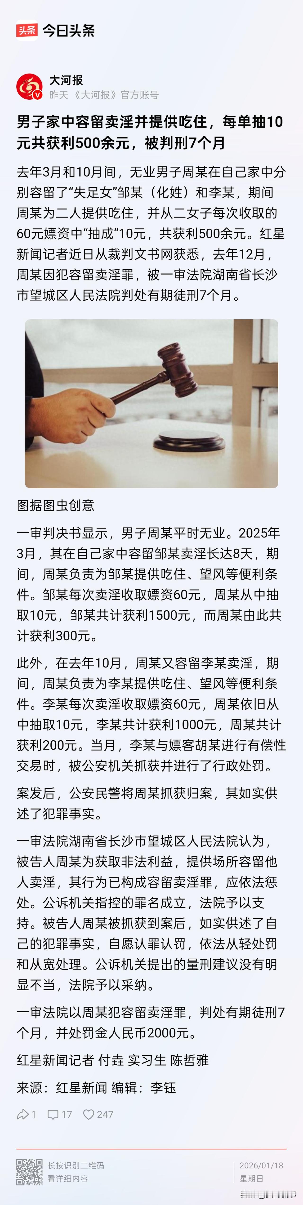 “聪明反被聪明误!”湖南长沙,一无业男子为了赚钱,想出个法子,把自家闲置房屋提供给失足女用于卖淫,自己则在此过程中抽取提成。谁料,男子刚获利500元,就被警方察觉并抓获归案。最终,该男子因涉嫌容留卖淫罪,被判处7个月有期徒刑,并处2000元罚金。男子悔之晚矣。 事情是这样的,周某平时没有正经营生,整天琢磨着怎么不费力赚钱。 2025年3月,他同失足女邹某相识,得知对方想找个地方“做生意”,周某脑子一转,当邀请对方来其家中,并承诺管吃管住,还帮忙望风。 就这样,邹某在周某家开始了卖淫活动,她每次收嫖客60元,周某就抽走10元。 邹某总共在周某家待了8天,邹某赚了1500元,周某则到手300元。 尝到甜头的周某在事后没想着收手。 同年10月,他又容留了失足女李某在自家卖淫,还是老规矩:管吃住、帮望风,每单抽10元。 这次李某赚了1000元,周某又到手了200元。 可这次就没有上次那么幸运了,李某和嫖客交易时,被警方抓了现行。 而这起嫖娼案,也顺藤摸瓜牵出了背后的周某。 周某事后被警方抓获并如实交代了他容留卖淫人员的事实。 事后,周某因涉嫌容留卖淫罪被检方提起公诉。 法院经审理后,以该罪判处其有期徒刑7个月,并处罚金2000元。 不得不说,周某的这笔买卖简直亏大发了,赚了500元,到头来换来了7个月刑期,还要倒贴1500,估计事后周某悔的肠子都青了。 可能有人会疑惑,周某总共才赚500元,数额不大,怎么就构成犯罪了? 在这里,大家需要搞清楚一个罪名—容留卖淫罪。 《刑法》第359条第1款规定,引诱、容留、介绍他人卖淫的,处五年以下有期徒刑、拘役或者管制,并处罚金;情节严重的,处五年以上有期徒刑,并处罚金。 简单说,就是为别人卖淫提供场所,或者帮着望风、提供便利条件,不管你是不是赚钱,只要做了这些事,就已经触犯刑法 。 根据相关司法解释规定,容留、介绍两个人以上卖淫,就必须要立案追究刑事责任 。 周某先后容留了邹某、李某两个人,已经达到了构罪的标准。 至于说周某得利多少,仅影响量刑轻重:如其非法获利5万元以上可认定为“情节严重”,处5年以上有期徒刑并处罚金。 周某之所以被判7个月有期徒刑、罚金2000元,一方面是考虑到他尚未达到“情节严重”的标准,另一方面也考虑到了他的从轻情节——被抓后如实供述、自愿认罪认罚。 总的来说,大家在生活里想赚钱无可厚非,但君子爱财,取之有道。 千万别抱着“投机取巧”“赚点小钱不碍事”的想法,触碰法律边界。 否则,即便真的赚到了钱,也怕是没机会去花。而等待你的,是刑期、是案底,还有满盘皆输的人生。 对此,你怎么看?欢迎大家在评论区留言。