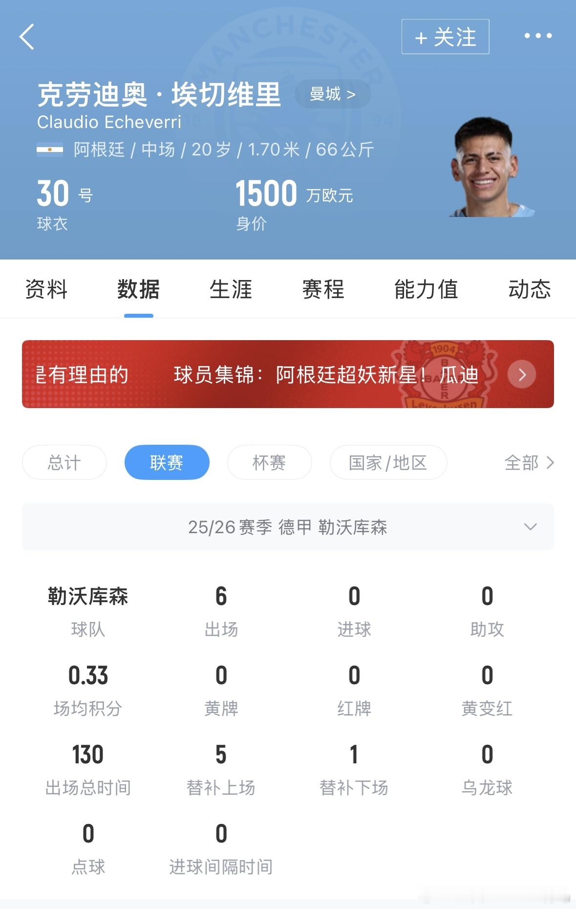 01月18日曼城官方宣布,球队20岁阿根廷中场埃切维里租借加盟西甲赫罗纳。埃切维里租借加盟赫罗纳直至2025/26赛季结束,目前该租借正等待国际转会许可批复这位阿根廷中场在德甲勒沃库森完成前半赛季的租期后,将前往城市足球集团旗下的兄弟俱乐部继续历练。现年20岁的埃切维里于2024年1月签约曼城,随后以租借形式留守河床队至2025年2月,此次他将与曼城队友维托尔·雷斯在西班牙俱乐部汇合。埃切维里曾为瓜迪奥拉的球队出战三次,其首秀是2025年5月我们在温布利足总杯决赛对阵水晶宫的比赛。随后的世俱杯上,他面对艾因轰出一记精妙任意球,斩获曼城生涯首球。效力勒沃库森期间,埃切维里累计出场11次(德甲6场+欧冠5场),不过在药厂造访阿提哈德球场的比赛中他始终未获出场机会。租借至西甲赫罗纳之后,埃切维里将争取获得更多一线队比赛经验。曼城全体成员祝愿埃切维里在西班牙的征程一切顺利!埃切维里现年20岁,2024年底从河床加盟曼城,转会费1850万欧。去年夏窗被租借至勒沃库森,代表勒沃库森出场11次送出1次助攻。目前埃切维里的德转身价为1500万欧元。