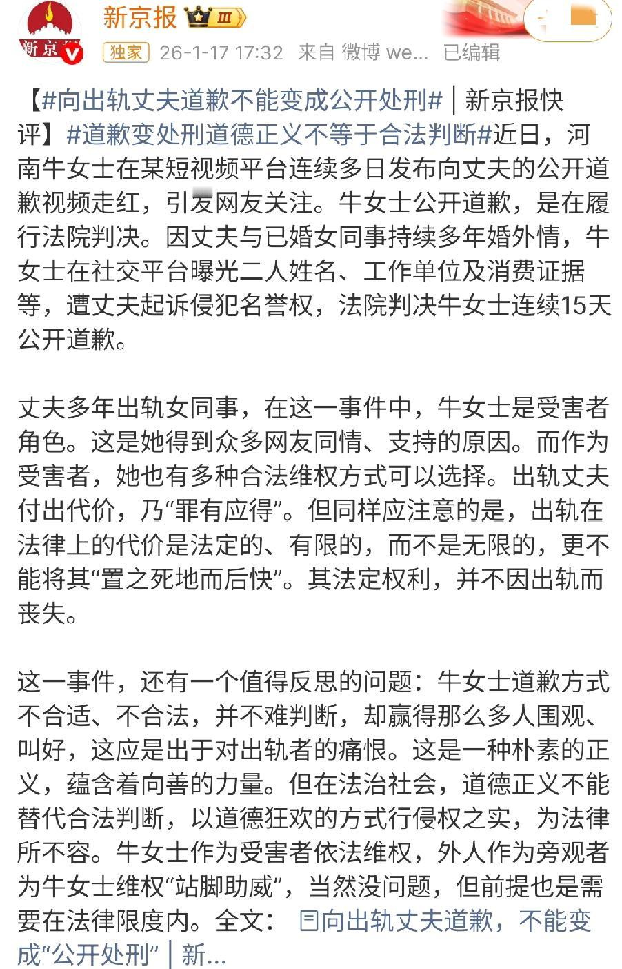 看到新京报对娜姐的指责, 内心不禁产生了个疑问, 它是“正经”官媒吗?不维公序良德,反站在伤风败俗那边。 牛娜的道歉视频大家都看了吧,先不说这是法院审核过才发的,视频中有对高飞和2+1进行侮辱和诽谤吗?陈述的都是以往的相关事实。 出轨这种事,法律上对此没有明确的处罚,顶多就是在离婚的时候,过错方少分一点财产,赔点精神损失费,这点惩戒对有些人来说就是不痛不痒。 既然法律的惩戒力度不够,那道德谴责凭什么不能补上?总不能让受害方咽下委屈,反倒让过错方逍遥自在吧? 而且我觉得,道德谴责还能在一定程度上,对那些蠢蠢欲动的人起到一个震慑作用:法律虽不惩罚你,但社会的公序良俗可饶不了你。 真搞不懂新京报为何会对这事进行批评,你们有知道的吗?欢迎来评论区一起探讨~