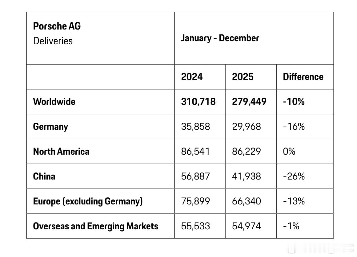保时捷25年在中国交付41,938台,同比下滑 26%。这已经是在去年同比下降 19%以及前年同比下降25% 的基础上,如果和四年前的峰值相比,保时捷中国只剩下了 2021 年同期销量的43.8%,比腰斩还要多。 而且,这不只是中国区市场的下滑,全球几大市场几乎都在下跌,总销量下滑10%。具体到车型,Macan依然是保时捷最畅销的车型,全年总交付84,328台(同比+2%),Cayenne全年交付 80,886 台(同比-21%),也是保时捷销量下滑的主要组成,背后原因一方面是24 年的 “补库效应”,上年需求提前释放,另一方面是新款迭代周期。保时捷明确 2026 年核心策略是 “按「价值优先于销量」原则管理供需”,对销量规模进行务实规划,不盲目追求数字增长。
