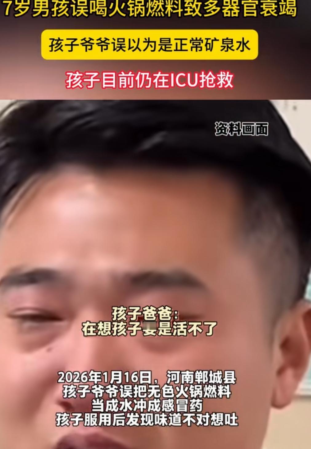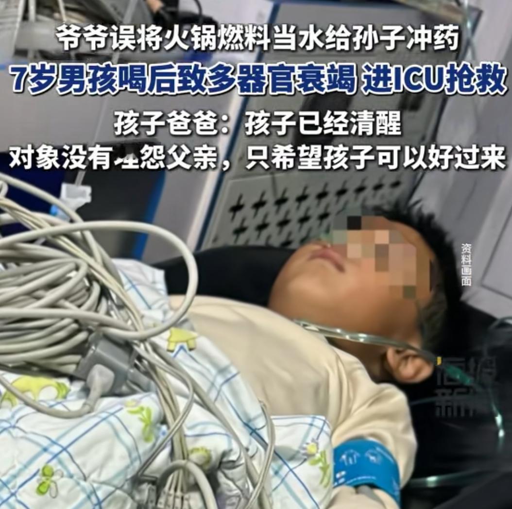 河南7岁男孩误喝矿物油 导致昏迷多器官衰竭 经过抢救,当前人已经醒了 据孩子爸爸说,摘去了胃管,不过肾还一直在流血,孩子爷爷也为此事,自责到说话吐词都不清楚了。 孩子住在ICU,一天一万多的费用,当前已花掉6万多,孩子爸爸是名基层辅警,收入不高,家里农村自建房。 已发动媒体广筹治疗费,截止目前已筹到了4万多。好多人在指责孩子父亲和爷爷,说装有矿物油的矿泉水瓶,没有标示怎么能放在家里。 其实他们也不想看到孩子这样,就事论事,去农村看下就知道了,好多家庭不标示的东西混装,尤其是老人。 孩子爷爷当时发现不对的时候,给孩子掏了喉咙,没吐出多少,外加转了三次院,错过了抢救的黄金时间。 对此有网友:“当爸爸的拿回来燃料装矿泉水瓶子里,不告诉家人,太大意,现在出事了,一家人都不负责任。” 也有网友说:“家庭抗风险能力太差,几万块钱都拿不出来,自己不小心点,出了事都靠别人救助帮忙活着吗?” 事情已经发生了,谁都不愿意看到孩子这样,何况是至亲,只能引以为戒,争论没用,坚强起来先度过难关。 肝脏功能损伤,后续治疗和恢复都是个问题,类似的悲剧发生了很多,盛食品或饮品的容器千万不能放危险品,大人一定要切记,希望孩子能扛过去吧! 河南男孩昏迷 7岁男孩误服矿物油燃料致多器官衰竭