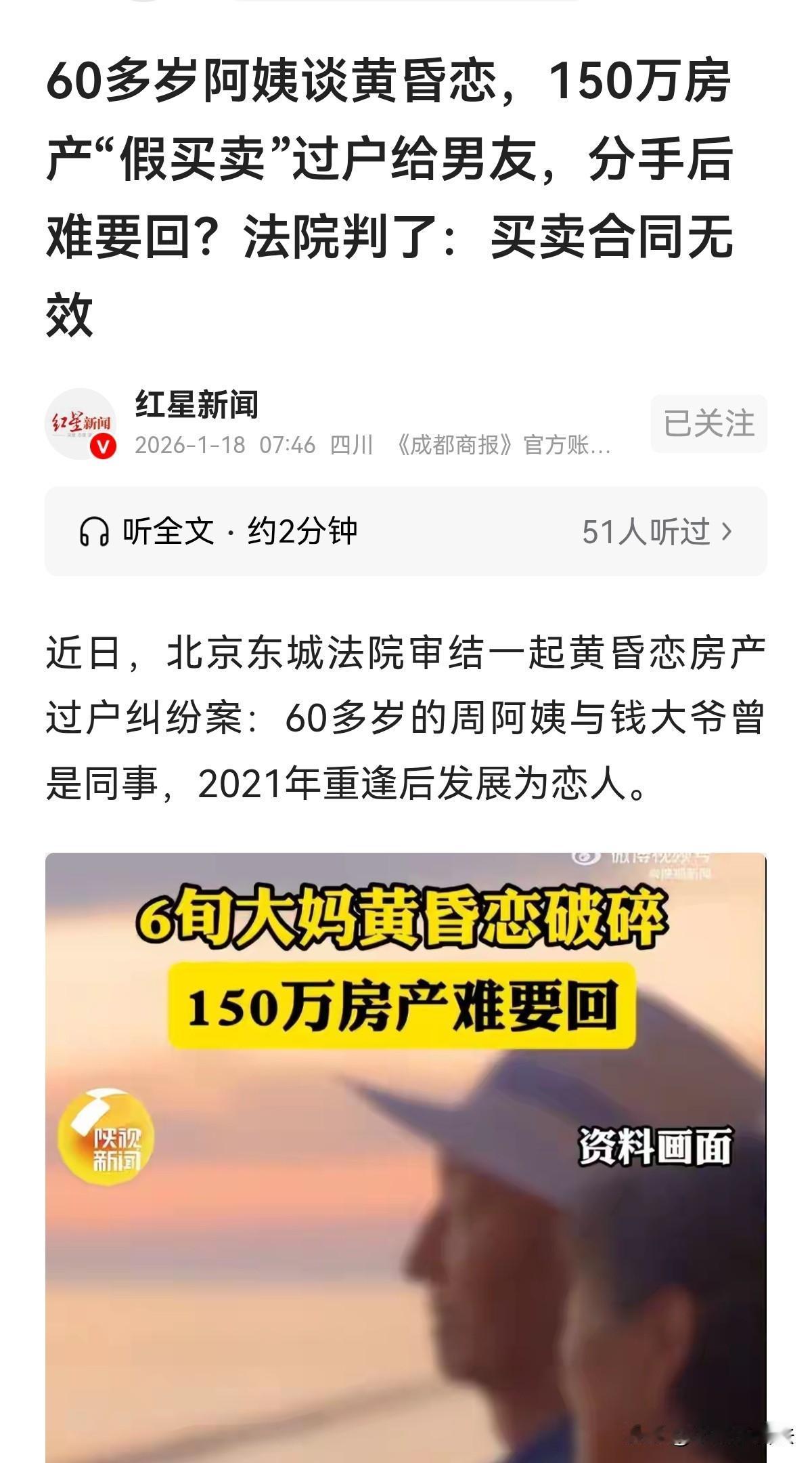 北京,六旬阿姨偶遇20年前同事,两人互加联系方式后,得知彼此都已单身,便谈起了感情,盘算着领证一起安度晚年。阿姨想把大哥占用多年的房子要回,便以买卖的形式150万卖给大爷,实则并未支付房款,他只付了土地出让金及房屋过户税费共计6万余元。后两人感情闹掰,阿姨多次要求将房子过户回来,大爷认为赠与完成,她无权要回,愤怒的阿姨将大爷告上法庭,结果他傻眼了! 周阿姨和钱大爷,年轻时曾是同事,2002年钱大爷离职后,两人就断了联系,一晃近二十年没来往。 2021年,已年过六旬的两人偶然重逢,热情相聊后得知彼此都没了老伴,慢慢两人便产生了感情,盘算着日后领证结婚,安度晚年。 周阿姨向钱大爷倾述烦心事,说自己名下有套房子,一直被大哥一家占用着,怎么说都不肯搬走。 虽两人感情越来越稳定,可钱大爷也不好给出啥主意。 周阿姨说想把这套房子当婚房。为了让大哥一家尽快腾房,她跟钱大爷商量以买卖的名义把房子过户到他名下,这样大哥一家总没理由再占着了,钱大爷当场同意。 2021年10月,两人签订了房屋买卖合同,以150万元的价格把房子卖给钱大爷。 当月19日,周阿姨配合钱大爷办了过户手续,房子正式登记到了钱大爷名下,不过他压根没支付房款,只是承担了6万多元的土地出让金和过户税费。 过户后,钱大爷搬进了这套房子里。钱大爷总说,虽房子在自己名下,但他打心底里觉得这房子还是周阿姨的,以后随时能再过户回去。 周阿姨曾表示,房子已给了钱大爷,不会再变更了。就这样,房子一直登记在钱大爷名下,两人继续相处着。 可相处久了,恋爱时的新鲜感褪去,生活里的琐事开始引发矛盾。 两人常为鸡毛蒜皮事争吵,周阿姨甚至对钱大爷的人品产生了怀疑,对他不再信任。 2023年3月,周阿姨不想再继续这段感情了,开始找钱大爷要回房子。 钱大爷当时说,要是想把房子过户回去,得等满两年房屋税费能低不少,到时再以买卖的方式办手续。 可他心里又觉得憋气:当初周阿姨跟自己交往,就是想利用他帮忙拿回房子!目的达到了就想甩人? 10月,周阿姨多次催促钱大爷办过户,可钱大爷要么敷衍,要么干脆不回复。 周阿姨一怒之下将钱大爷告上了法院,要求确认当初的房屋买卖合同无效,让钱大爷把房子过户回自己名下。 法庭上,两人各说各的理。 《民法典》第658条规定:赠与人可在财产权利转移前撤销赠与,但经过公证的赠与合同不得撤销。 钱大爷辩称房子是周阿姨自愿赠与自己的,就是为了解决她和大哥的房产纠纷,现在赠与都完成了,房子就是自己的,周阿姨没权利要回去。 虽假以买卖形式,自己未付房款,可周阿姨也明确表示房子就是他的了,不会变更了。 更何况自己当初花的6万多元税费和土地出让金。 《民法典》第661条规定:赠与可附义务,受赠人需按约定履行义务;若未履行,赠与人可撤销赠与。‌‌ 周阿姨说,当初签买卖合同根本不是真的想卖房,就是为了让大哥腾房、跟钱大爷结婚当婚房用,而且两人也约定了两年后过户回来,现在钱大爷反悔了。 就算算是赠与完成,那也是以结婚为前提的,现在感情破裂,婚也结不成了,房子理应还给自己。她有权撤销赠与。 钱大爷不乐意,自己掏了6万元,要再重新更名,那必须对自己进行赔偿。 《民法典》第146条规定,行为人与相对人以虚假的意思表示实施的民事法律行为无效。以虚假的意思表示隐藏的民事法律行为的效力,依照有关法律规定处理。 法院审理后,把事情的来龙去脉捋得明明白白。 法官认为,周阿姨和钱大爷签房屋买卖合同的时候,根本没有真实的买卖意思,也没有发生150万元的真实交易。 这份合同就是两人故意串通好的“虚假合同”,按照法律规定,这种以虚假意思表示实施的民事法律行为是无效的。 从两人的聊天记录和庭审陈述来看,当初过户房子,一是为了让周阿姨大哥腾房,二是想把房子作为婚后共同财产,所以才登记在钱大爷名下。 虽然恋爱期间两人都口头说过房子归属,但那些大多是感情里的随口承诺,不能作为确定房屋归属的依据。 该买卖合同因缺乏真实交易意图而无效,法院需探究背后隐藏的真实法律关系进行裁判。 法院最终判决:确认周阿姨和钱大爷签订的房屋买卖合同无效,当初过户产生的6万多元税费由周阿姨承担,返还给钱大爷。 钱大爷配合周阿姨把房子过户回去,并且从房子里腾退,现在判决已生效,双方并未上诉,都自动履行完了义务。 有人说,这钱大爷,眼睛里还真只有钱呀!你没实际付款过,这合同肯定的会无效呀!真是掉钱眼里了! 有人说,周阿姨太精了,既谈了恋爱,又要回了房子,自己啥都没损失,这布局做的好! 对此您怎么看? 关注@小栗子看法 ,一起交流讨论,学习法律知识!