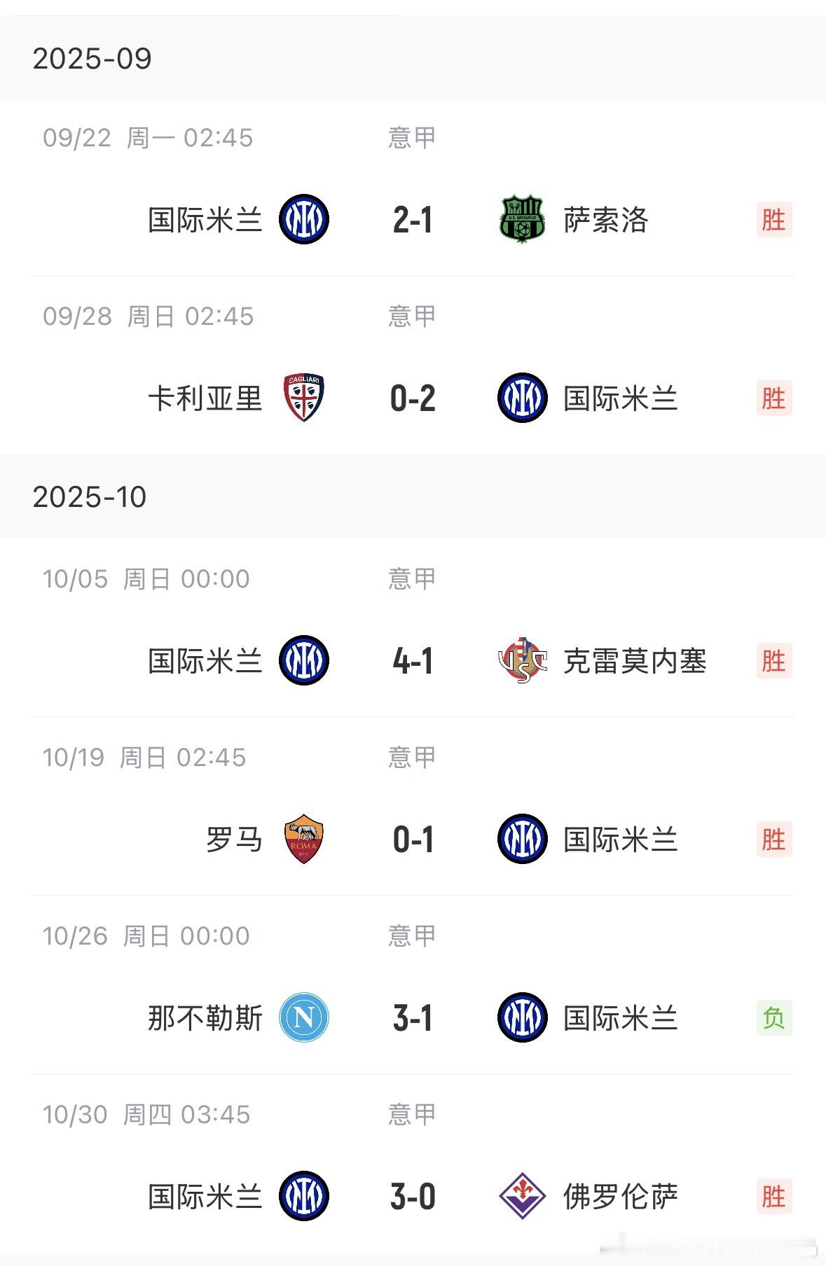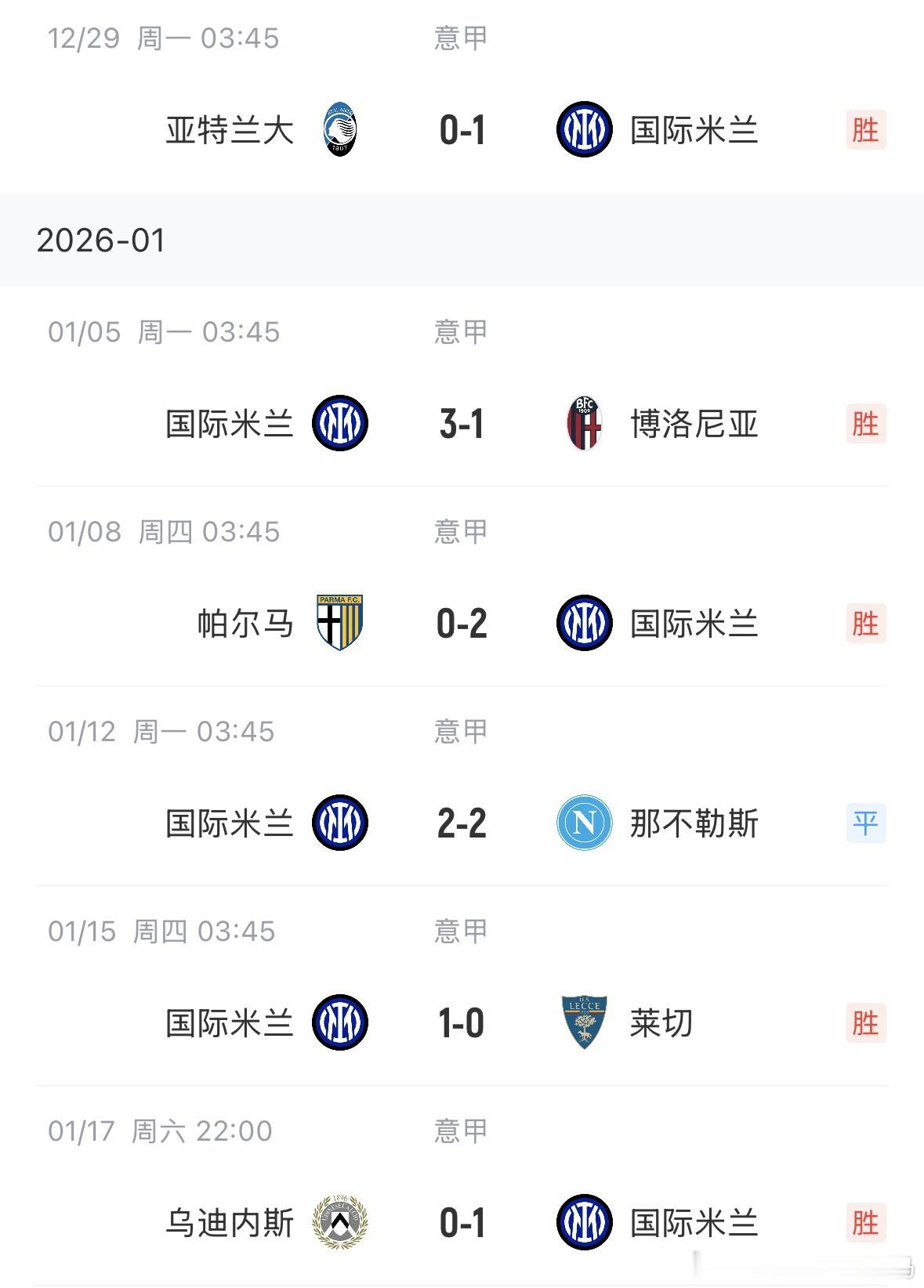 01月18日 意甲第21轮,国米1-0小胜乌迪内斯,全取3分。目前国米意甲排名榜首,领先第2米兰6分。国米在近18场意甲比赛中,取得15胜1平2负的战绩,只在对阵目前联赛排名第2与第3的米兰和那不勒斯身上,没能全取三分。近18轮没能全取三分的比赛国米0-1米兰那不勒斯3-1国米国米2-2那不勒斯意甲