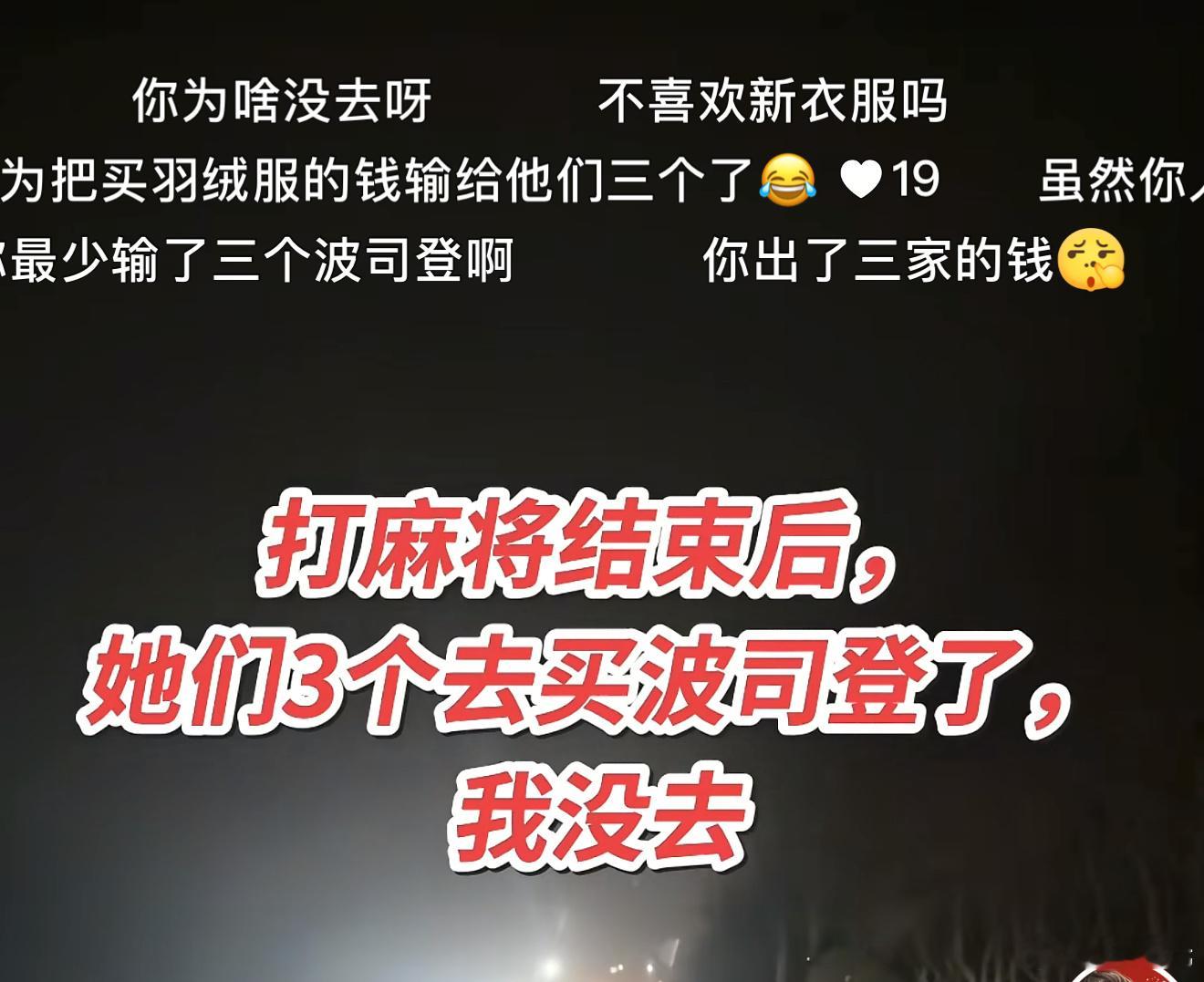 打麻将的后果麻将局散伙,仨人雄赳赳—起奔去波司登羽绒服了,现在风一吹,我浑身上下只剩“穷”这个字在发热。