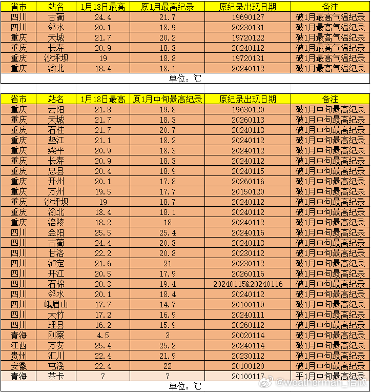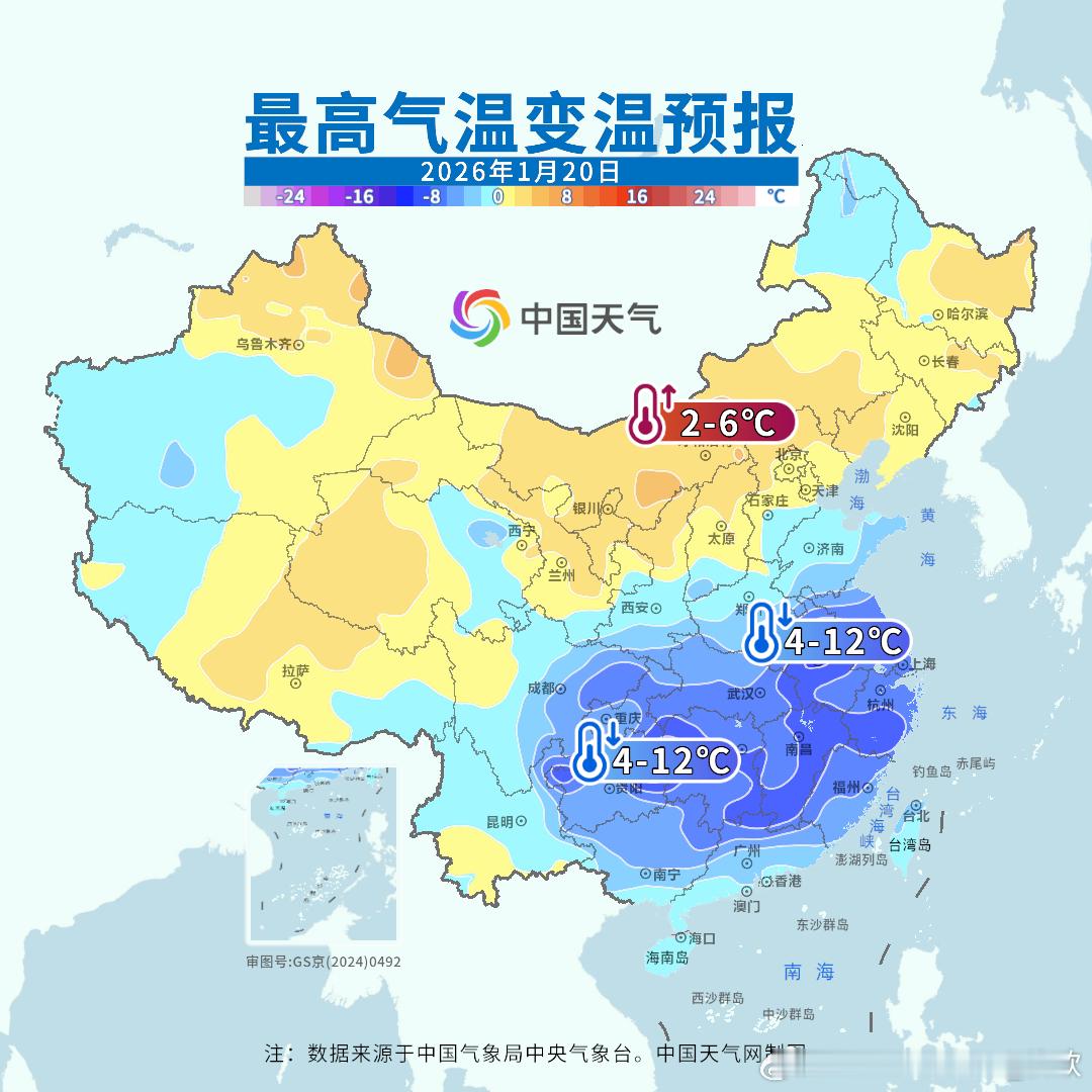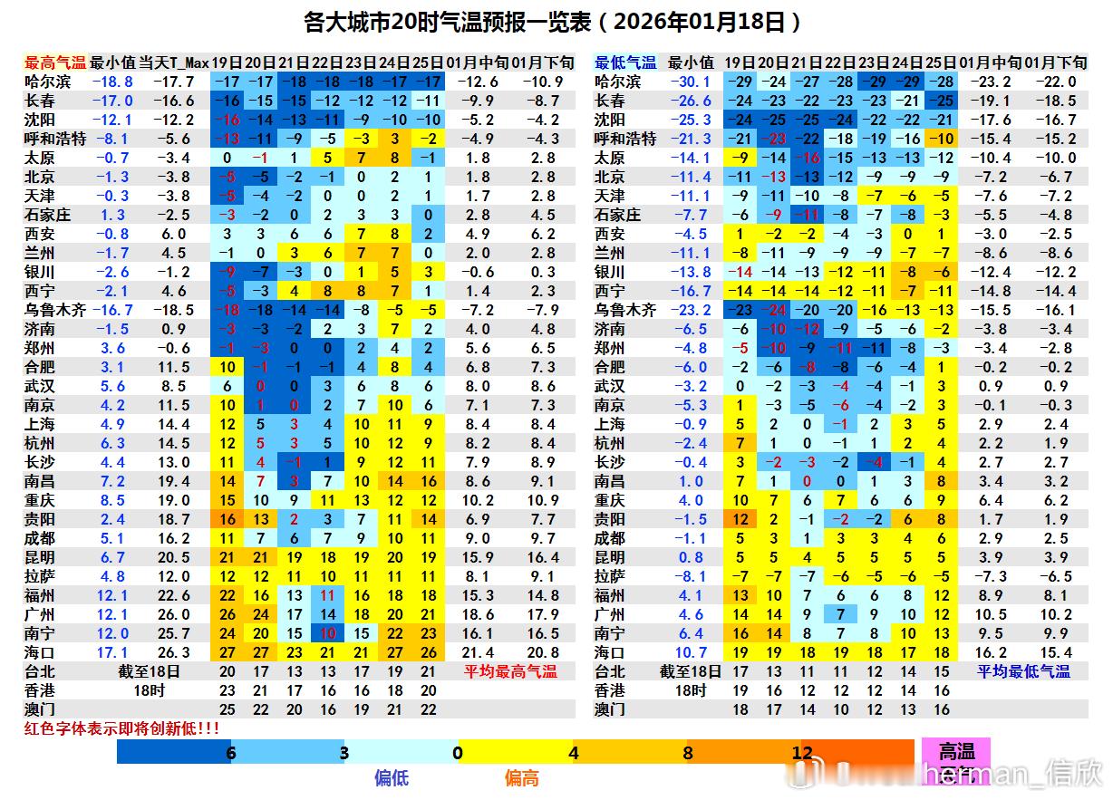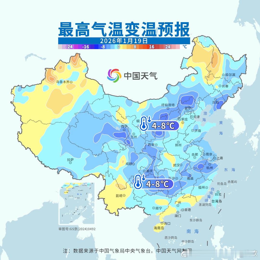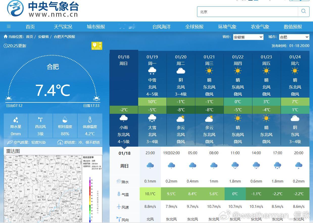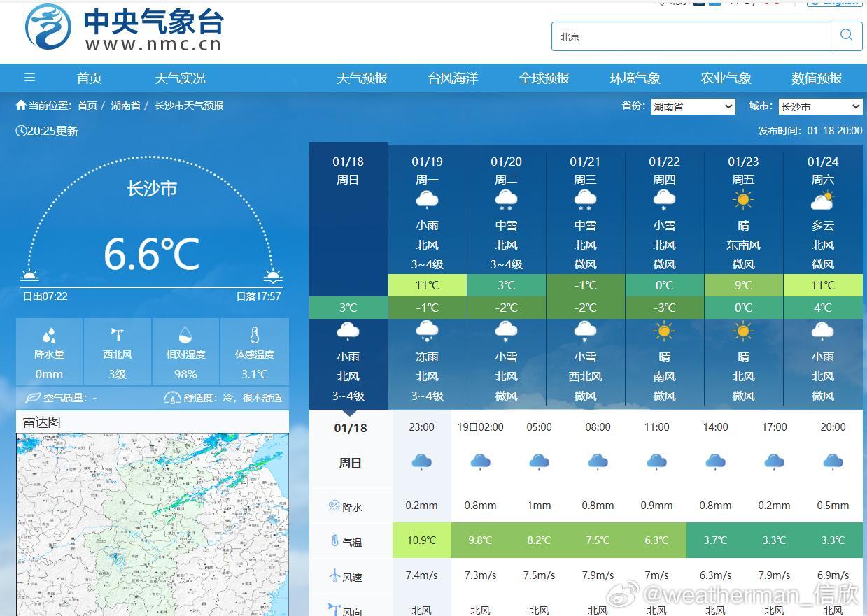 【寒潮推动气温创新低】今天在寒潮到来前,青海四川重庆贵州江西安徽有26个国家气象站气温破1月中旬最高纪录,其中四川重庆还有6个站点,打破了1月最高气温纪录,比如重庆沙坪坝19℃。未来寒潮继续南下,关注三个事情:剧烈降温,气温倒降,气温创新低。图5为今天下午和21日最高气温对比。0℃线从河南南压到湖南和贵州。10℃线从长江中下游南落到岭南。华南今天还有不少20℃以上的区域,21日只是海南岛还残存一些20℃+。而且在明后两天的降温,伴随雨雪,白天无光照,还有冷空气注入,南方多地气温可能倒降。比如合肥、南京、长沙预报的未来24小时最高气温,不是出现在明天下午而是就是今晚,已经成为过去式。明天下午合肥气温可能降至0℃以下。南京和长沙明天下午不到4℃,因此穿衣出行,请参考最低气温。而且未来华北黄淮到江南多地气温将创今冬新低,比如20日晨,呼和浩特零下23℃、北京零下13℃、济南和郑州零下10℃。21日晨,太原零下16℃、石家庄零下11℃、合肥零下8℃、长沙零下3℃。22日晨,武汉零下4℃、南京零下6℃、上海零下1℃。最厚实的衣服赶紧备好。