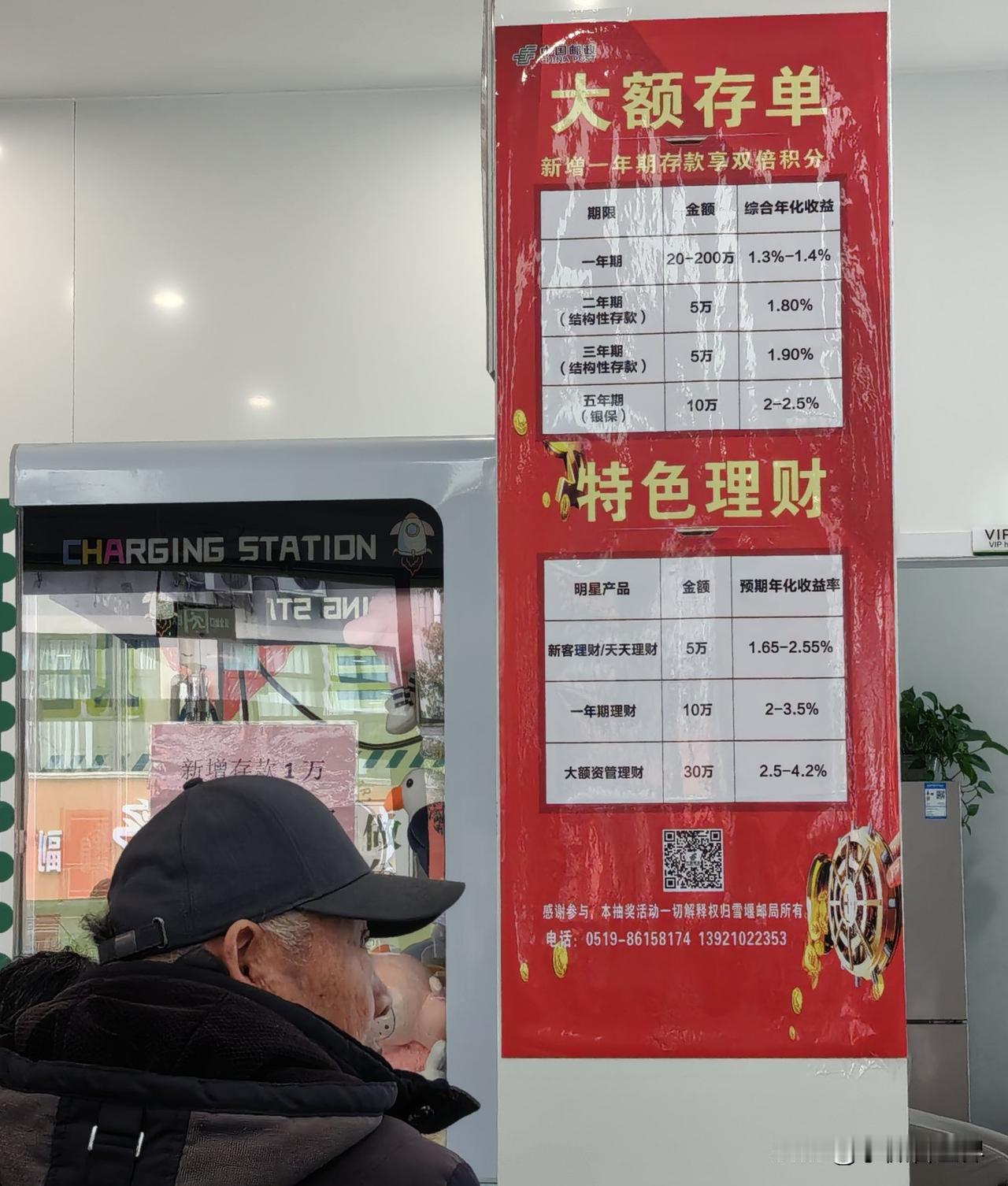 有张邮储银行的存折18号到期了,赶紧去邮局看看。 这是下午三点多的时候,大厅里除了几个老年人,空空荡荡。 正对大门的墙上,贴着一张存款信息,一看要至少五万才可以起存,利息最多也不过4.2%,还要30万才可以! 现在银行利息是越来越少了,三个月0.65%,六个月0.86%,一年0.98%,二年1.05%,三年1.25%,五年也不过1.30%! 除非大额存款利息才稍微高点,想了想,还是银行保险,就继续存着吧。 总之,现在挣钱不容易,想存款也利息越来越低。但说来说去还是银行最靠谱。友友,你们的余钱都放哪里了?