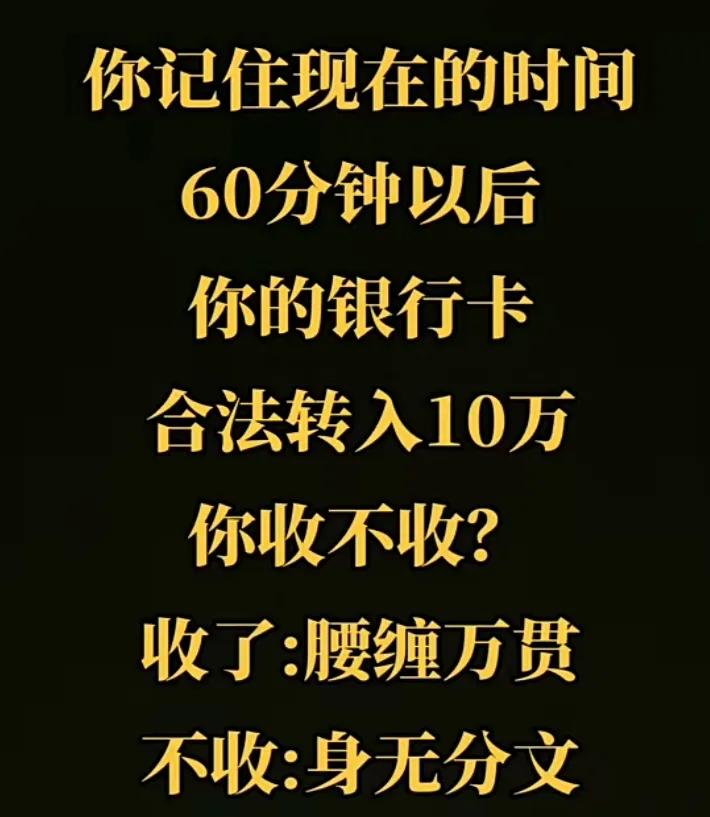 银行卡转账一般多久能到记住这个时间,60分钟以后,你的银行卡,合法转入10万元,你收不收,收了腰缠万贯,不收身无分文,想清楚了吗?快收了吧