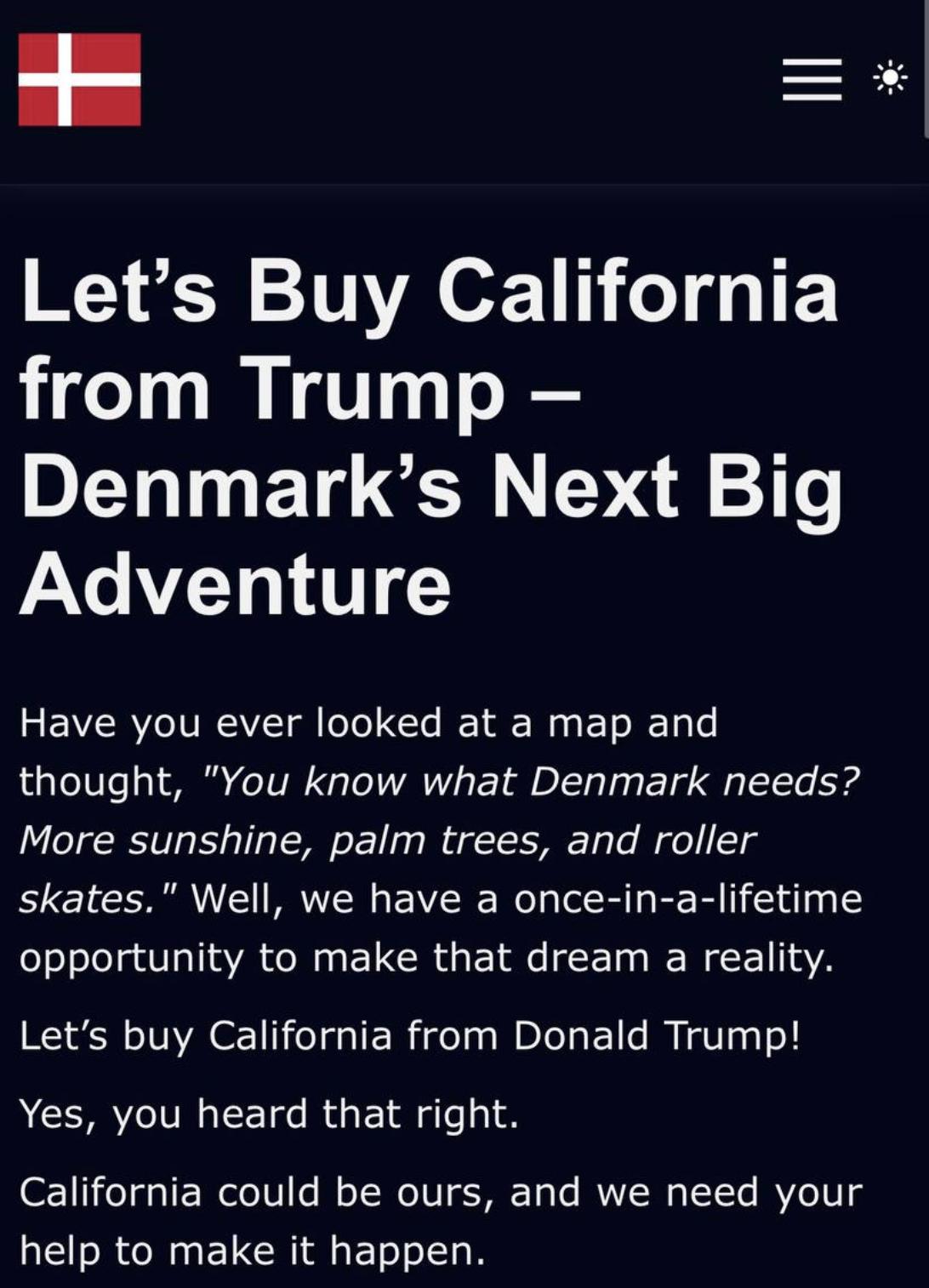 【超过28万丹麦人签署了一份请愿书,要求从美国手中买下加利福尼亚州。 请愿书的作者承诺将丹麦的hygge(舒适惬意的概念)带到好莱坞,在比佛利山庄修建自行车道,并在每个街角售卖smørrebrød(丹麦开放式三明治)。 这份请愿书带有讽刺意味,已经存在大约一年了,但由于显而易见的原因,它突然获得了极高的人气。】