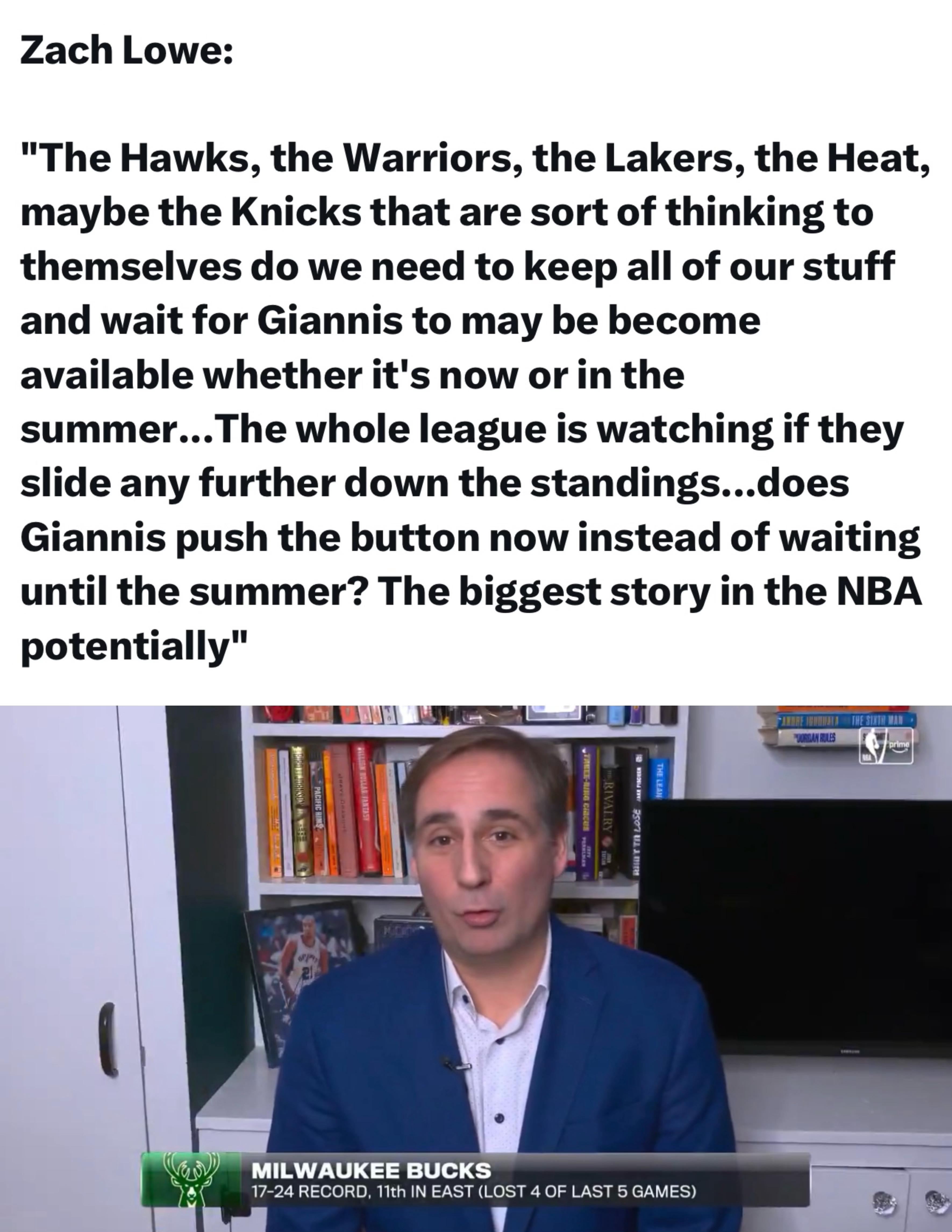 记者Zach Lowe:老鹰、勇士、湖人、热火和尼克斯等球队可能会保留他们的交易资产,以防扬尼斯·阿德托昆博提出交易申请。此前,字母哥曾表示自己不会申请交易。