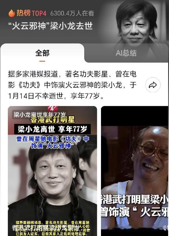 据多家港媒报道,“梁小龙不幸逝世!”去世之前还在晚上公开批评人贩子,没有想到仅经过几天便传来噩耗。 1月18号,港媒传来的消息让不少影迷心头一沉,77岁的功夫明星梁小龙已于1月14号在深圳突发疾病离世。 这个消息来得太突然,毕竟就在他走前几天,还在短视频里公开痛批人贩子,直言希望对致残儿童的人贩子判死刑,语气里满是愤慨。 更让人疑惑的是,梁小龙14号离世后,他的短视频账号却没停更,13号到17号接连发了十几条视频,穿着同款蓝色西装、白裤子,内容全是呼吁关注拐卖儿童问题,甚至18号还有账号互动痕迹。 不少网友一开始都以为是假消息,毕竟前一秒还在刷到他的视频,下一秒就传来死讯,换谁都难以接受。 后来他的友人证实了死讯,家人才说明本想办完后事再公布,可团队持续更新视频的操作,还是引来了诸多不满。 说白了,77岁的老人大概率不会自己运营账号,背后团队借着他的热度继续发库存,哪怕人已离世也不暂停,这种消费逝者的吃相确实难看。 之后账号又发了条模仿他口吻的告别信,说去很远的地方拍电影,想保持神秘感,反倒让争议更激烈了。 了解梁小龙的人都知道,他的一生比电影还传奇,作为“香港四小龙”之一,他不是科班出身,15岁就靠做武行替身谋生,一身真功夫是实打实练出来的,还拿过全港搏击比赛冠军。 1982年《陈真》里那句振聋发聩的台词,让他成为几代人的记忆,后来《功夫》里的火云邪神,又让他再度爆红。 生活里的他性子刚,当年因为立场问题被封杀,转行经商亏得一塌糊涂也没低头,晚年定居成都,开武馆每月只收800学费,困难家庭的孩子还免单,家里装修简单,冰箱都是普通牌子,一点明星架子都没有。 他晚年直播带货被说晚节不保,也坦然回应是为了改善家人生活,实在又通透, 谁能想到,这样一位硬朗的老人会猝然离世,去世前一天,他还和好友吃火锅、送签名字画,精神头十足。 如今追悼会定在26号,低调送别这位传奇武者,只是账号风波像根刺,遮住了他生前的骨气与温柔。 一代功夫巨星落幕,留下的不仅是经典角色,还有骨子里的坚韧,希望他一路走好,也盼着背后团队能停止消费,让逝者安息。